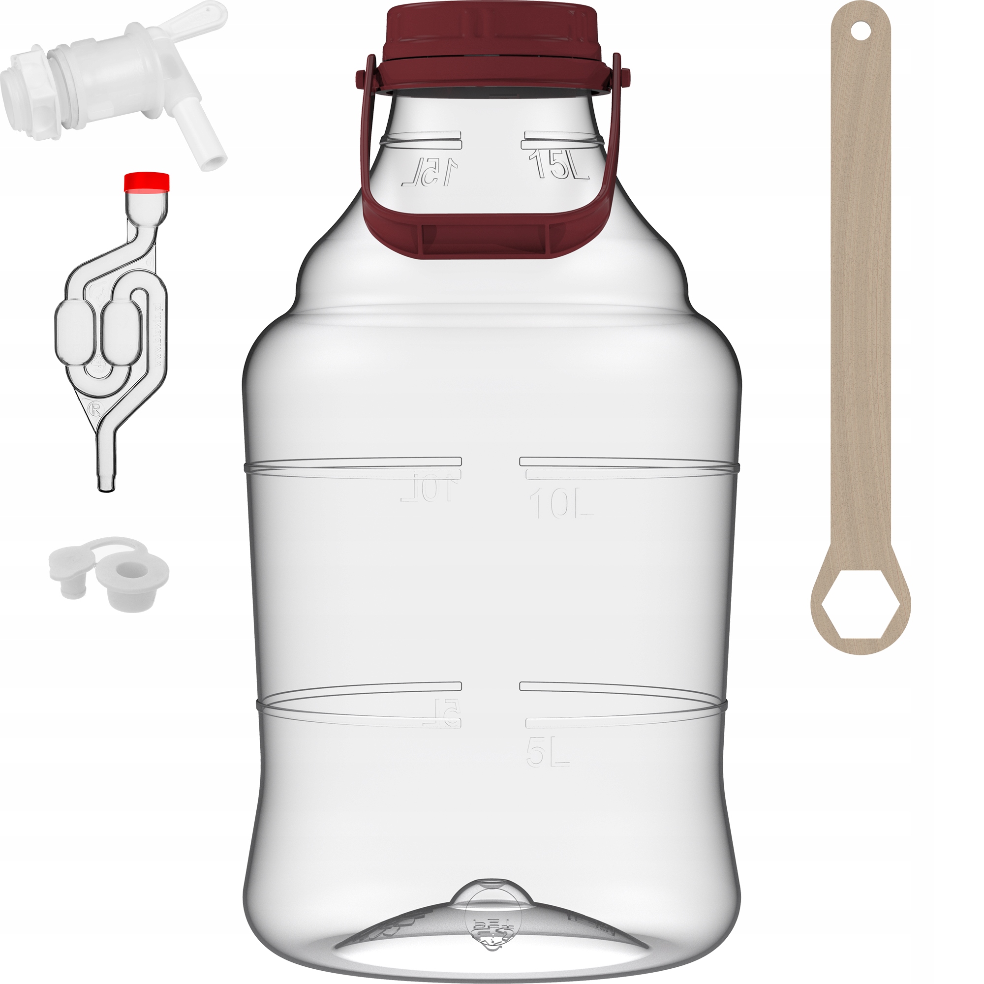 Набір включає все, що потрібно зробити, щоб зробити вино легким, швидким та задоволеним задоволенням ефектом. ПЕТ потужністю 15 л , дизайн якого полегшує перенесення, переміщення налаштувань та роботи з фруктами. Він довговічний, елегантний і - що варто підкреслити - виготовлений із сертифікованого матеріалу вільного, безпечного навіть при алкоголі до 95%. Це не зламає і не захистить вас від втрати цінного напою. У цій повітряній кулі ви можете легко встановити практичний кран. У наборі ви також знайдете точний рецепт із таблицею пропорцій, який допоможе вам досягти відмінних результатів.