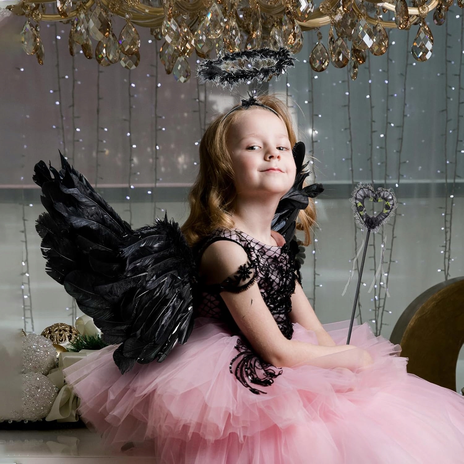 Опис продукту: представляємо костюм ангела з трьох частин, який включає крила ангела, пов’язку на голову ангела та чарівну паличку ангела. Крила виготовлені з якісного штучного пір'я та картону, завдяки чому пір'я виглядають дуже реалістично. Гумка для волосся ангел виготовлена з пластику. Паличка ангела виготовлена зі стрічки та пластику.