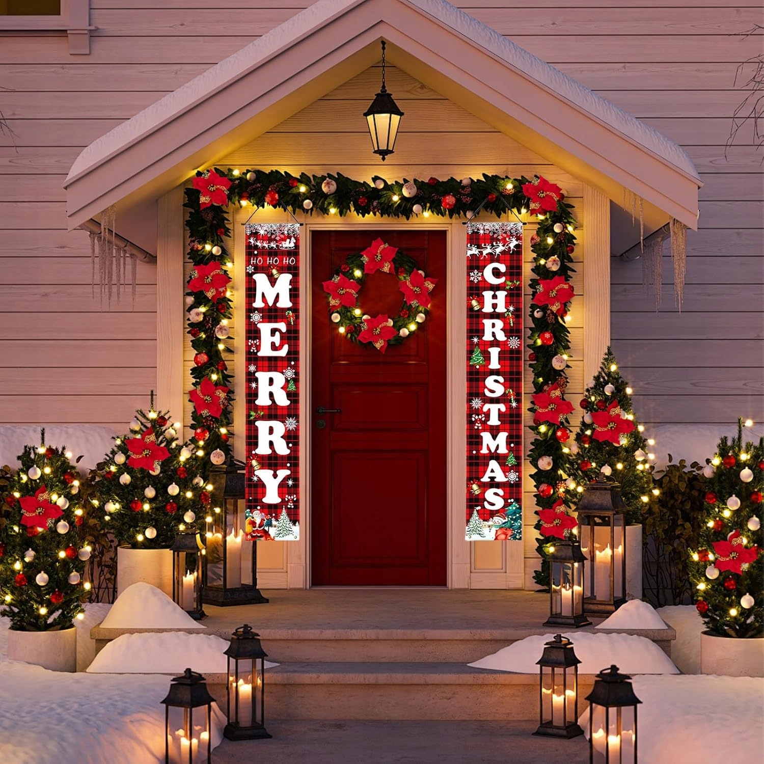 Про цей продукт Великі різдвяні банери - доповніть свої різдвяні прикраси нашим набором із 2 дуже великих різдвяних дверних банерів розміром 180 x 30 см (Д x Ш). Великі літери добре помітні навіть здалеку та додають святковий відтінок вашому відкритому простору. Радісна різдвяна атмосфера: перетворіть свій дім на святкову зимову країну чудес із чарівними святковими темами, такими як Різдво, сніговики, ялинки, олені, сніжинки, подарунки, різдвяні панчохи та цукерки. Класичний візерунок Buffalo в клітку додає будь-якому куточку затишного свята. Надійне та стабільне кріплення: наші різдвяні банери мають міцні верхню та нижню стійку, щоб забезпечити надійне утримання та запобігти вітру від здування банерів. Відмінна якість: виготовлені з тканини високої щільності, наші різдвяні дверні банери надзвичайно міцні та довговічні для використання на вулиці. Яскраві кольори залишаються яскравими навіть у дощову погоду та не тьмяніють - якісна прикраса для вашого різдвяного дому. Універсальні прикраси: прикрасьте будь-яку ділянку нашими різдвяними прикрасами! Будь то вдома, в офісі, магазині, на стіні, в саду, на терасі чи в дверях гаража – ці вражаючі прикраси підходять для внутрішнього та зовнішнього використання та створюють святкову атмосферу.