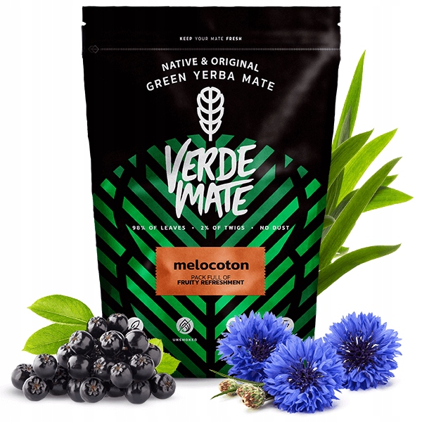 Verde Mate Green Melocoton - зелений мате йерба прямо з бразильського тропічного лісу! Товсто нарізане листя з невеликим вмістом паличок поєднується з трав'яними та фруктовими добавками: чорноплідна горобина, лимонна трава, пелюстки волошки, лист шовковиці, лист ожини та натуральні аромати ожини та персика. Все це створює дивовижну і дуже приємну композицію. Ніжно-солодкий смак, характерний для зелених, практично бездимних сухофруктів, сподобається як початківцям, так і більш просунутим майстрам.