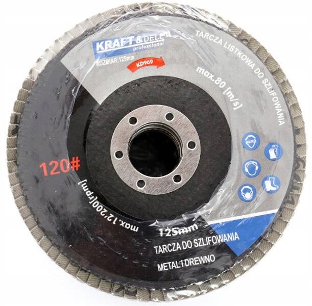 позначка: KRAFT&DELE модель: KD967 Тип пристрою: пластинчастий диск для шліфування Зовнішній діаметр: 125 мм Внутрішній діаметер: 22,23 мм Грануляція: 80
