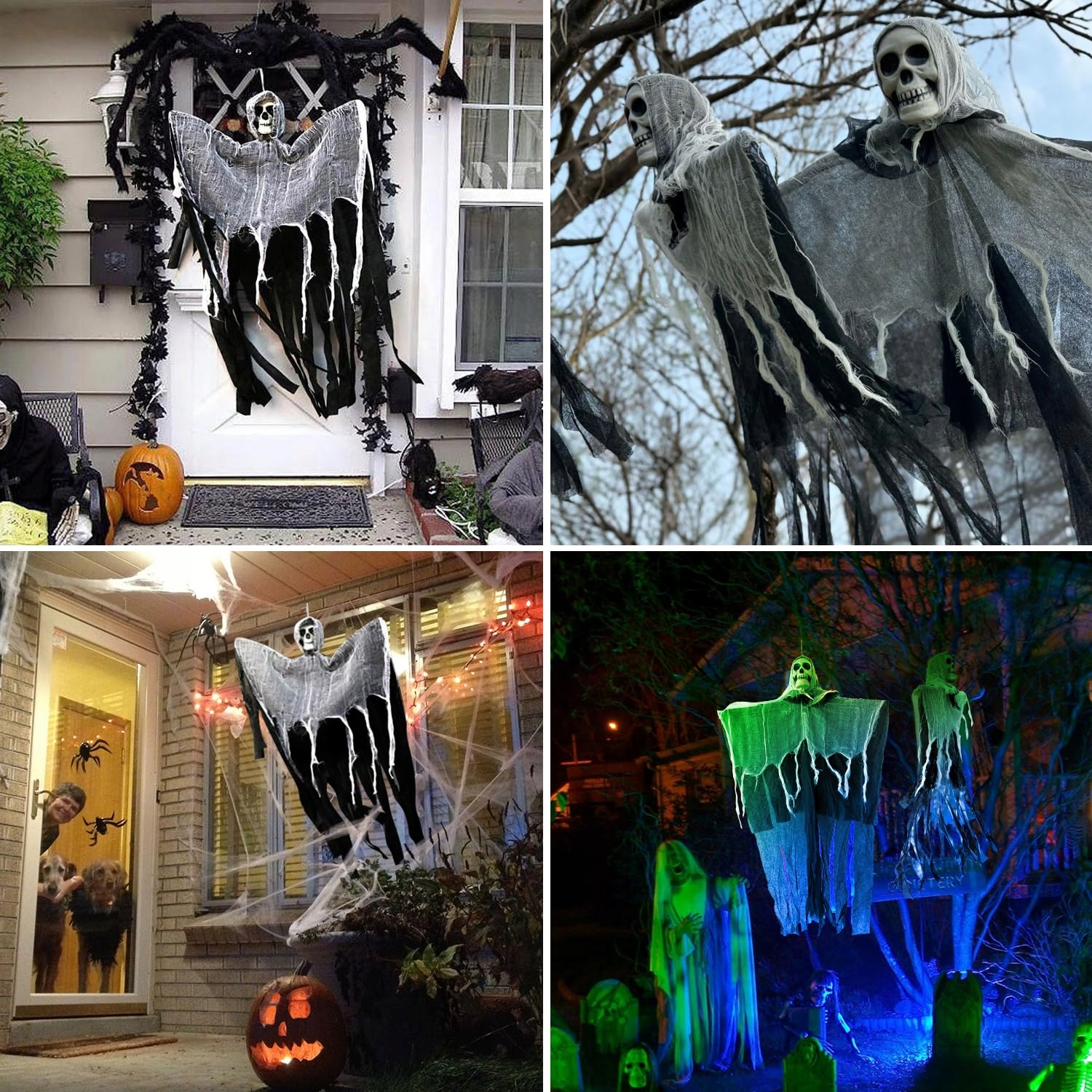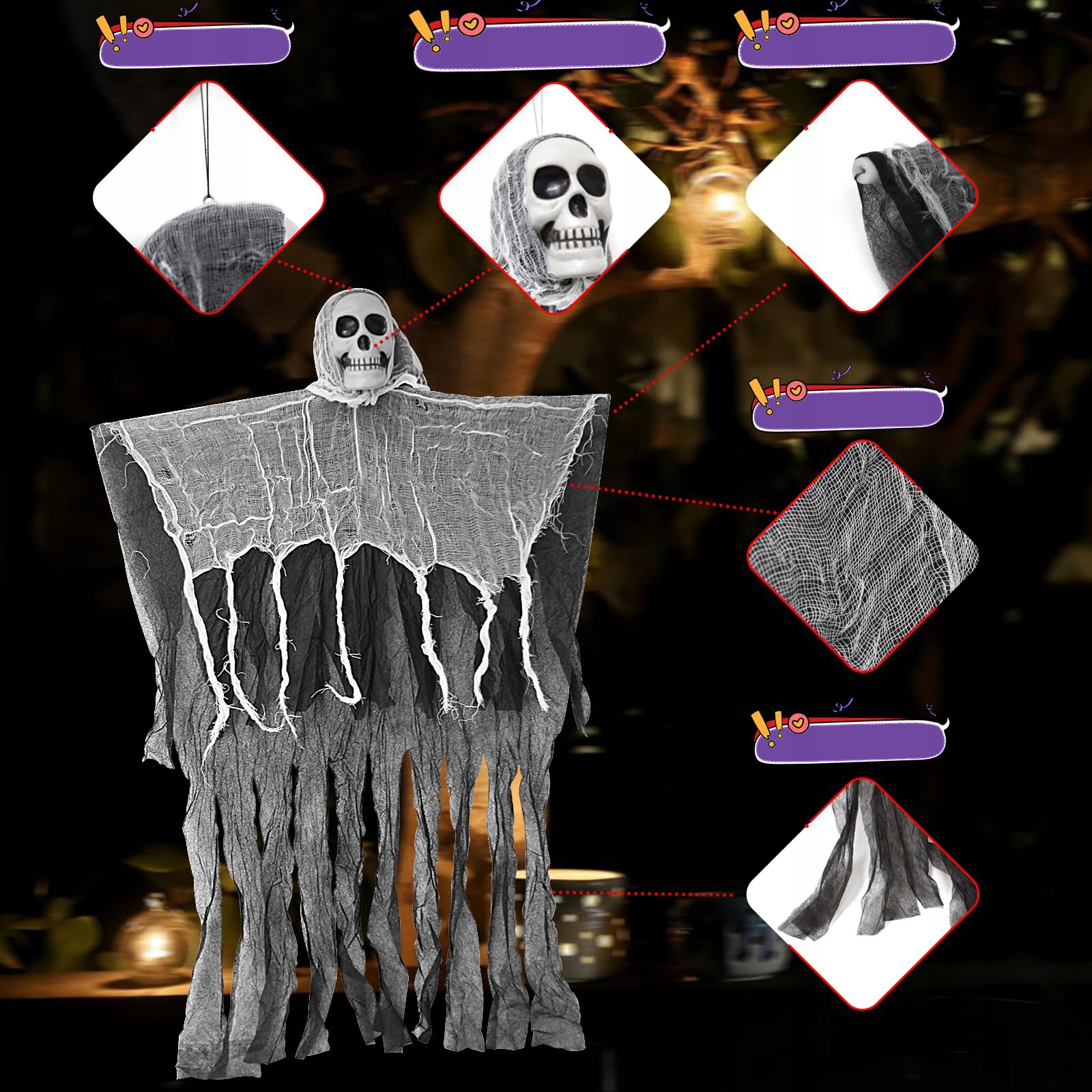 Розмір підвісного літаючого скелета, щоб повісити, - це близько 60 x 85 CM . Привид прикраси на Хеллоуїн виготовлений з високоякісної пластики та тканини, він легкий і довговічний і може бути використаний для наступного Хеллоуїна.