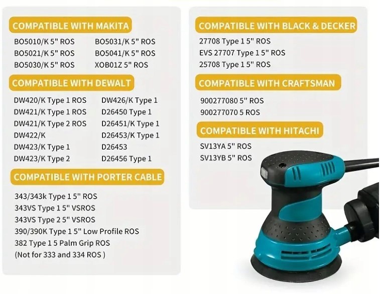 - Дисковий шліфувальний диск 125 мм на липучці, 8 отворів для ексцентрикових шліфувальних машин, заміна Makita 197468-0 з трьома гвинтами, Hikoki and Dewalt DT3600 - D0138