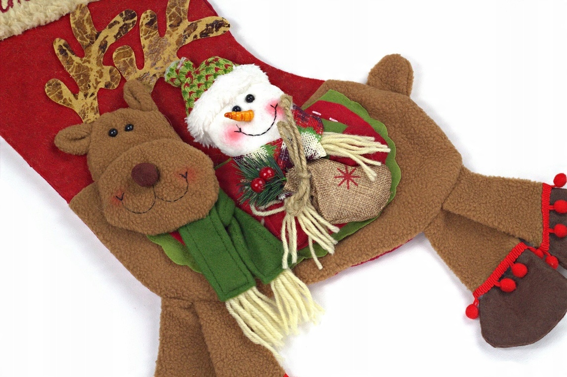 Шкарпетки мають вішалку, тому ви можете повісити їх де завгодно. Велика 3D аплікація у вигляді оленя, сніговика та Санти. Святковий настрій у кімнату принесе Дід Мороз. Висячі ніжки пожвавлять і додадуть шкарпеткам привабливості.
