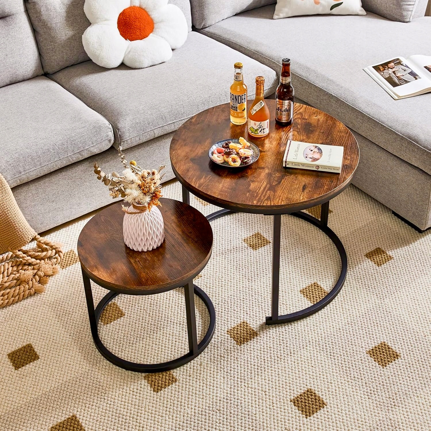 Цей набір з двох круглих журнальних столиків є ідеальною пропозицією для людей, які цінують промислову естетику, сучасні форми та універсальну функціональність. Поєднання теплого відтінку рустикального дуба з чорною металевою рамою створює гармонійну та модну композицію, яка чудово підійде для вітальні, спальні та вітальні.