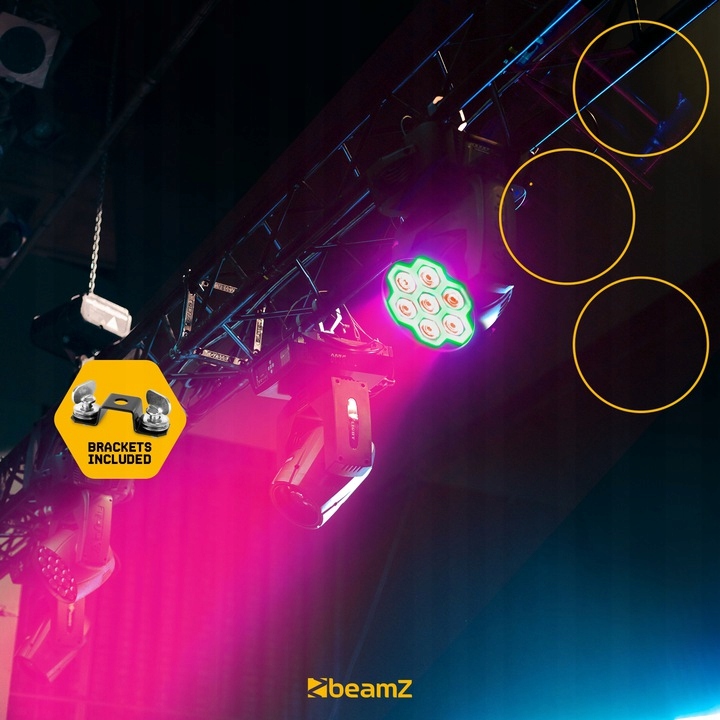 Крім 7 світлодіодних ламп, FUZE712 також оснащений своєрідним неоновим ефектом. 60 світлодіодів SMD розташовані навколо світлодіодів RGBW у формі шестикутника. За допомогою цього додаткового ефекту ви можете створювати чудові візуальні ефекти, що робить FUZE712 унікальним у своєму роді. Іншим ефектом є стробоскоп від FUZE712, який може блимати до 21 разів на секунду. Сама голова має великий діапазон обертання 540° і нахилу 180°, що забезпечує великий просторовий діапазон.