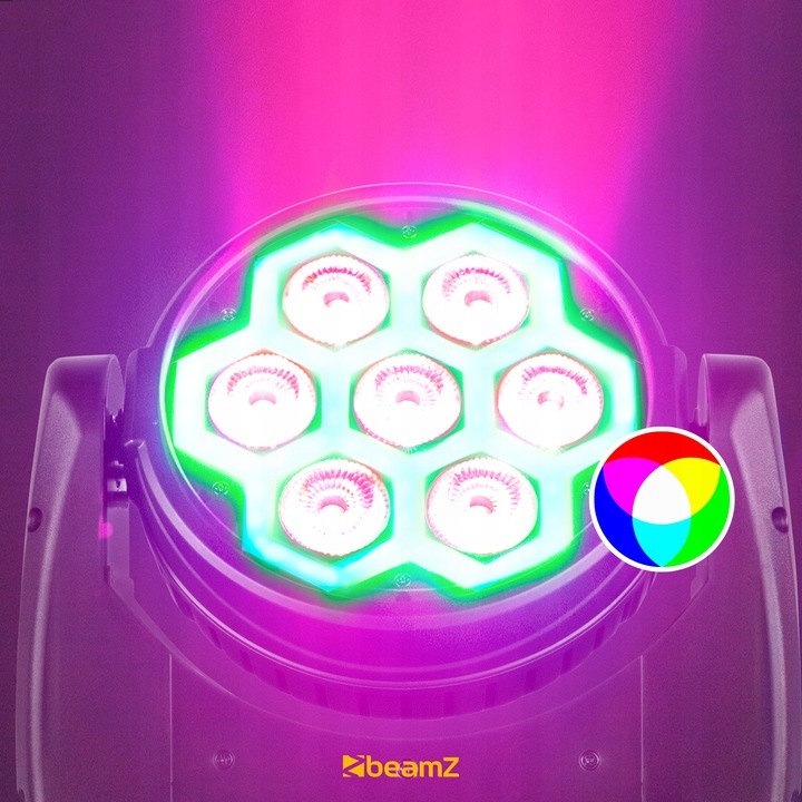 7 світлодіодів FUZE712 забезпечують безпрецедентну кількість світла. Світлодіоди — це світлодіоди 4 в 1 червоного, зеленого, синього та білого кольорів. Змішуючи ці кольори або граючи з інтенсивністю, ви можете створити величезну кількість кольорів, у тому числі пастельні, за допомогою цієї рухомої головки.