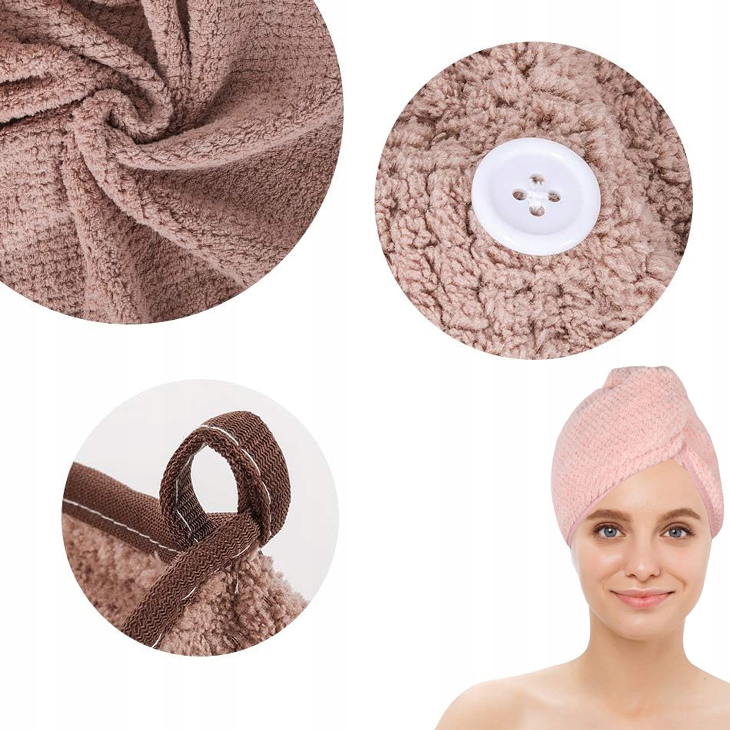 оснащений кнопкою та петлею на спині, щоб запобігти розпущенню рушника, гарантуючи, що він буде безпечно на місці під час висихання волосся. Простий у використанні та підходить до всіх типів та довжини волосся.