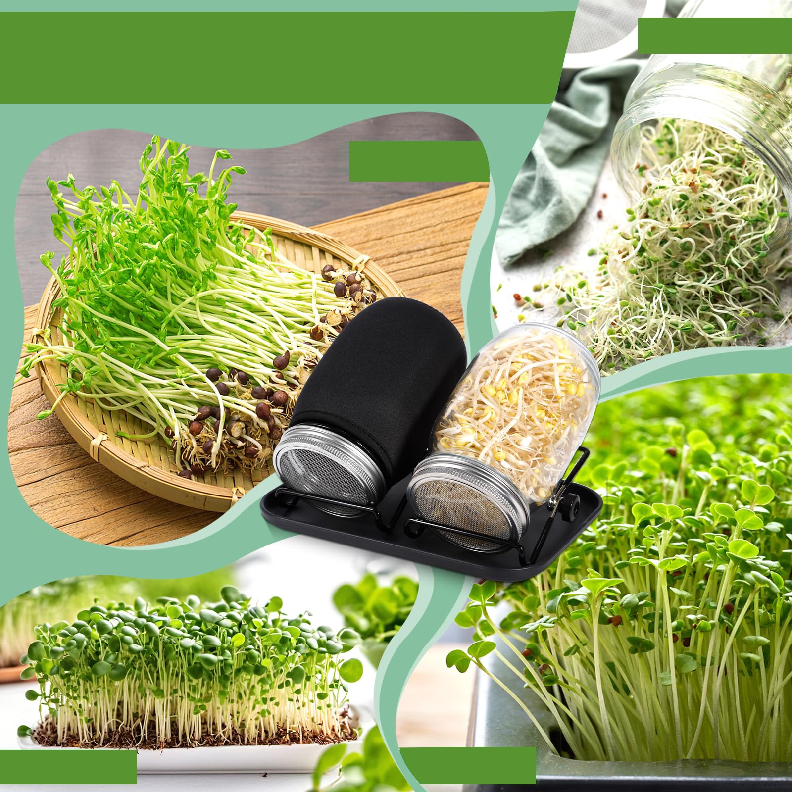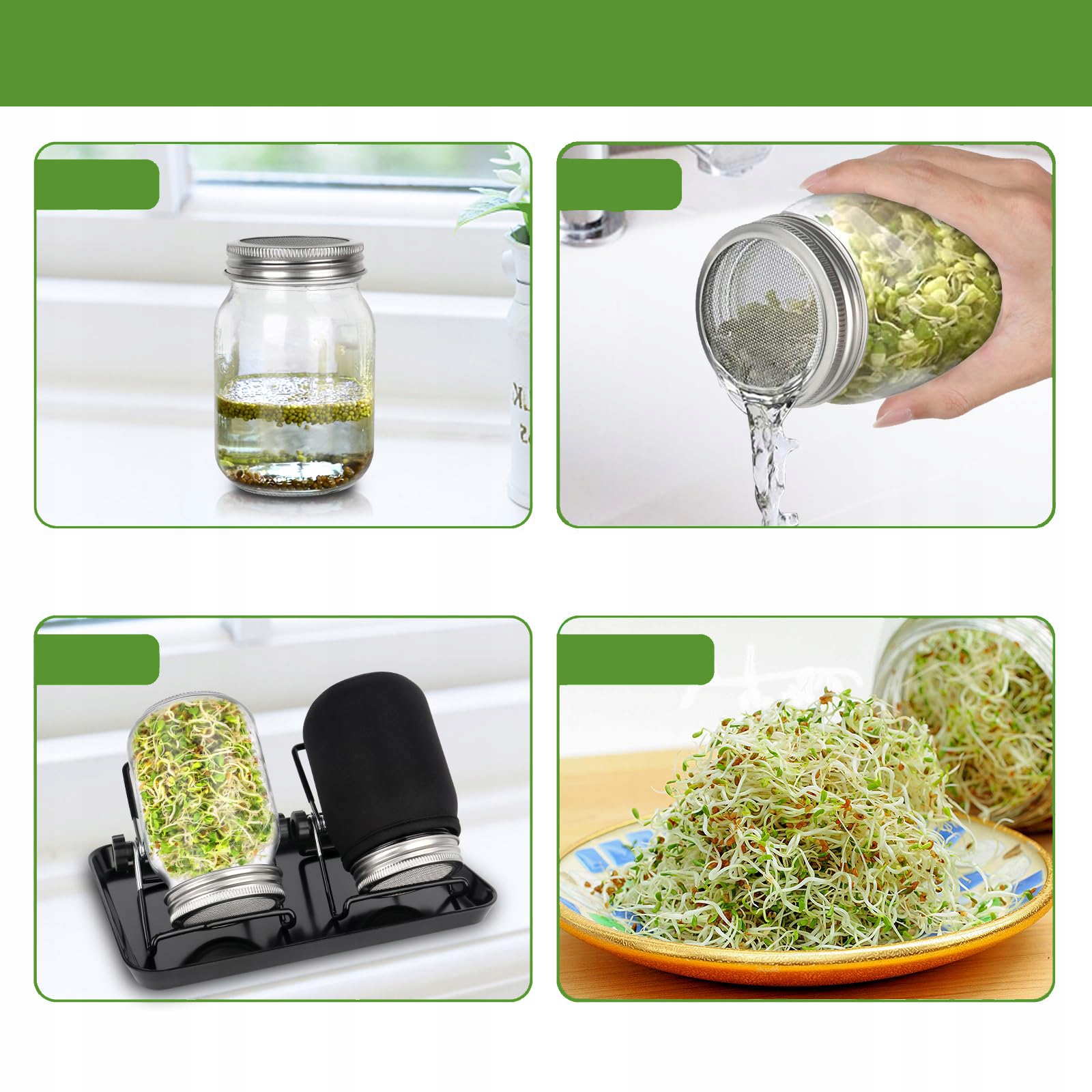 За допомогою цього набору банок для пророщування насіння ви можете легко вирощувати органічні паростки вдома та насолоджуватися свіжими паростками з родиною в будь-який час. Цей набір для пророщування включає дві банки Мейсона 1000 мл, дві сітчасті кришки з нержавіючої сталі для пророщування, дві стійки, два світлих плафони, одну щітку та один піддон.