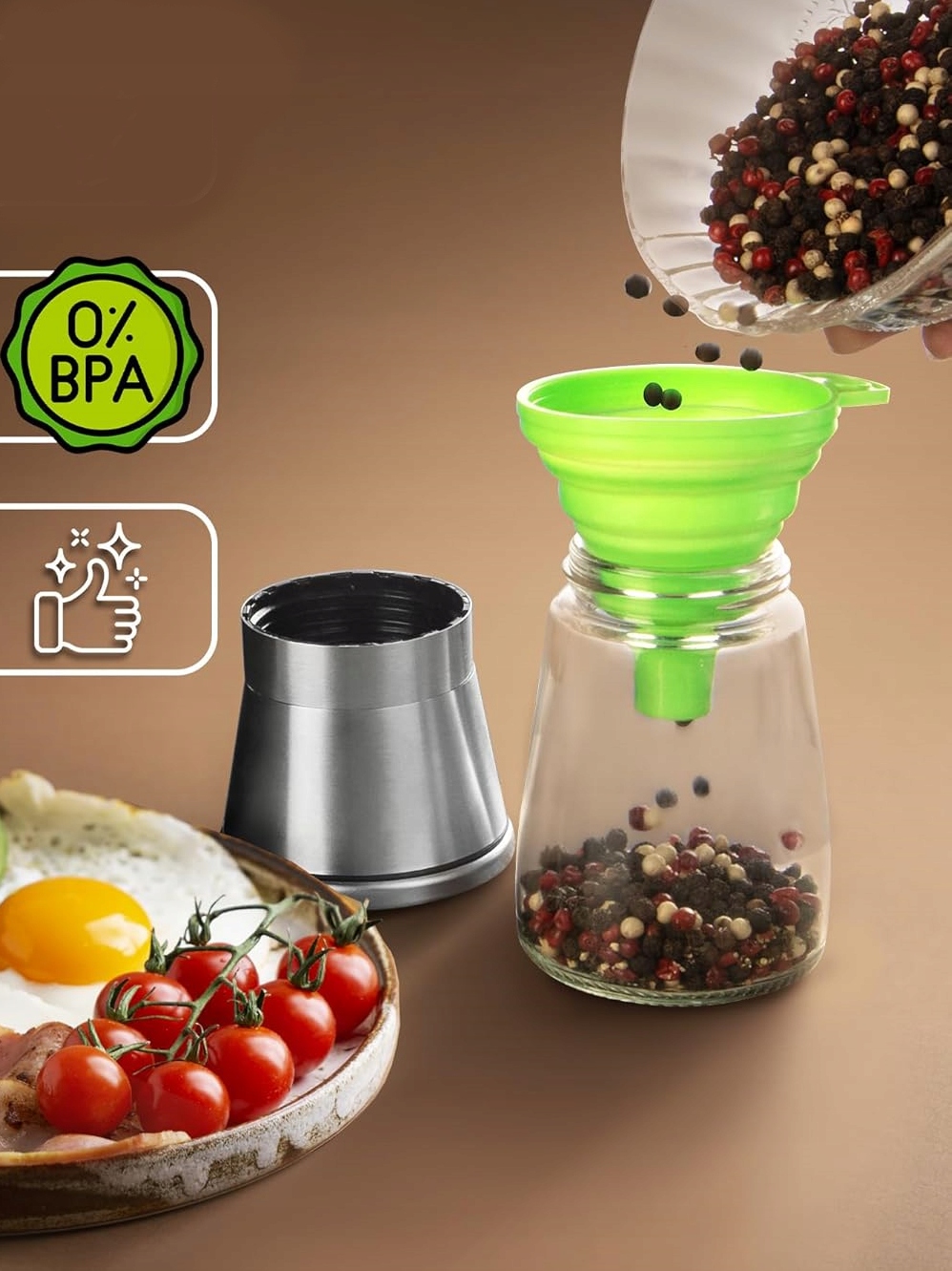 Чорний перцевий шліфувальник доповнюється. Щоб додати більше спецій, просто вийміть кріплення сталі. Ми пропонуємо безкоштовну силіконову воронку, яка забезпечує швидке та безпроблемне завершення.