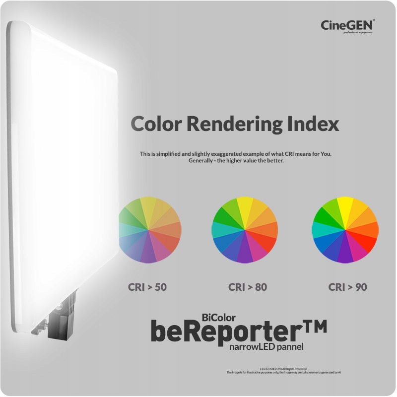Серцем лампи BeReporter™ є власна технологія BiColor™. Основною перевагою є використання двох незалежних світлодіодних матриць, що випромінюють світло з різними колірними температурами - теплим (3200К, імітація лампочок) і денним (5500К, аналогічно сонячному). Це дозволяє не тільки плавно регулювати колір світла в цьому широкому діапазоні, але й точно підлаштовувати освітлення під переважаючі умови, усуваючи необхідність використання додаткових коригуючих фільтрів. Ця технологія також перетворюється на чудовийіндекс передачі кольору (CRI), гарантуючи, що кольори на фотографіях і записах будуть вірними та природними, без небажаного знебарвлення.