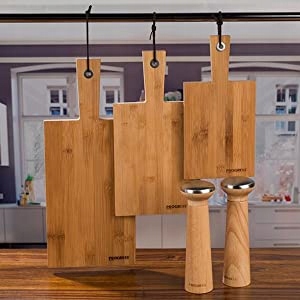 Виготовлені з природного міцного бамбука, обробні дошки Progress мають сучасний дизайн і є ідеальним доповненням до вашої кухні. Надзвичайно універсальні, ви можете використовувати дошки щодня, коли готуєте ласощі для своїх дітей, а також як інгредієнти для великої сімейної трапези або для подачі сиру, м’ясних нарізок тощо, коли у вас є гості. Завдяки розумним тримачам ви можете легко складати свої твори, дошки також можна легко зберігати завдяки шкіряним петлям для підвішування, які входять у комплект.