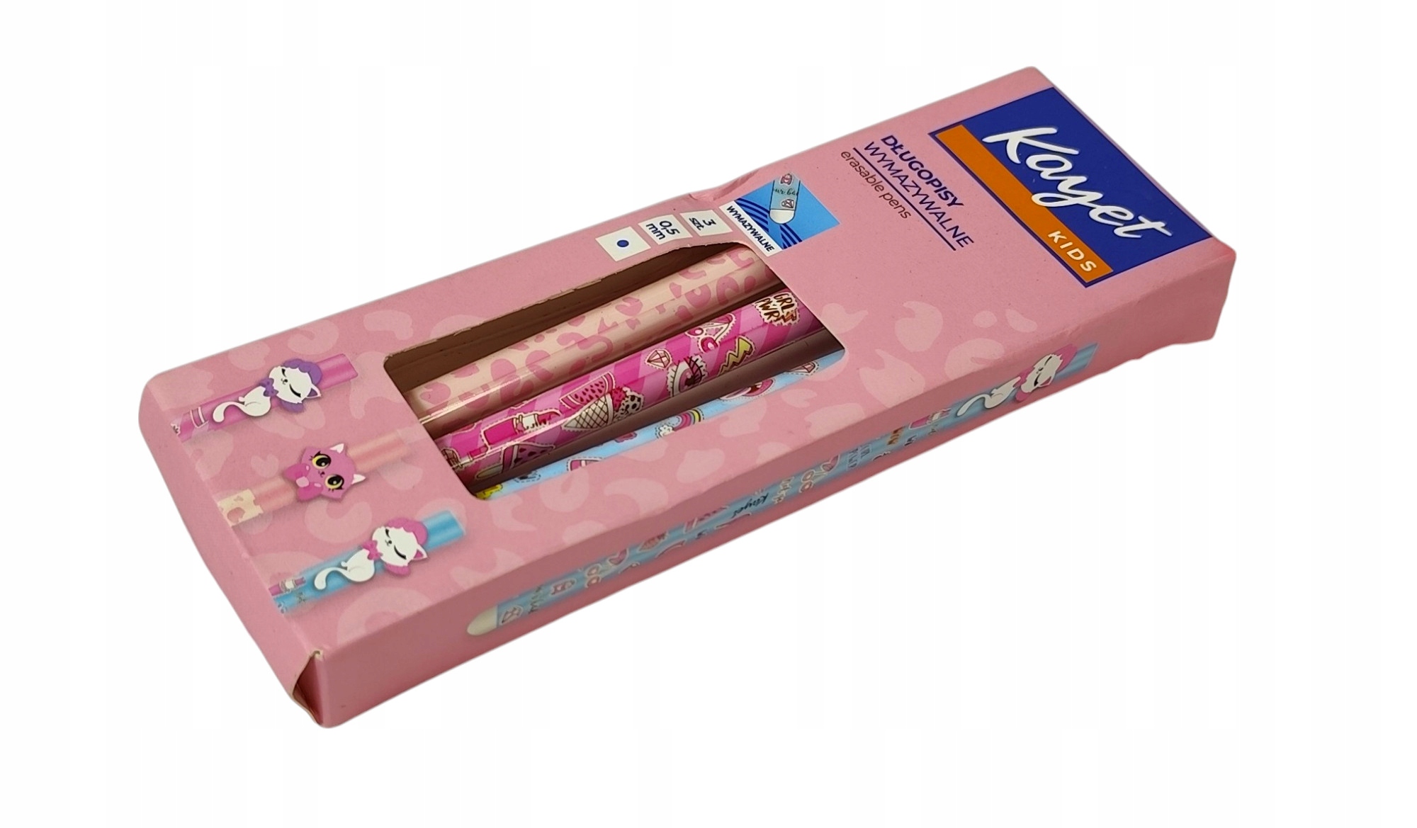 Ручки пишуть із синьою тушшю, і завдяки спеціальній підказці стирання ви можете легко покращити помилки без використання консилера. Комфортне житло та легкість письма забезпечують комфорт навіть при більш тривалому використанні. Вилки з мотивом кошенят не лише захищають внесок проти сушіння, але й виконують декоративну функцію, роблячи повсякденне навчання чи рейтинг.