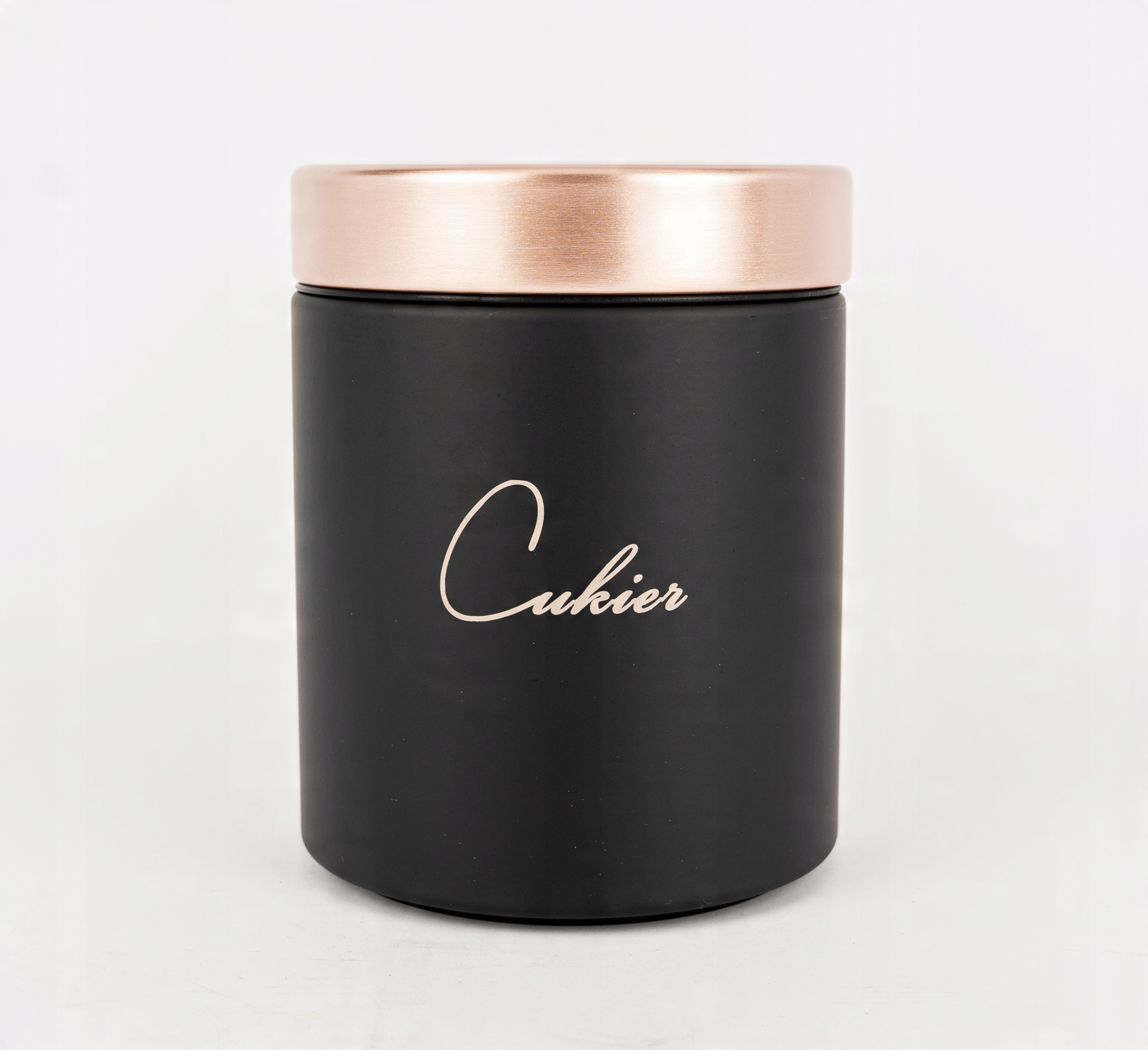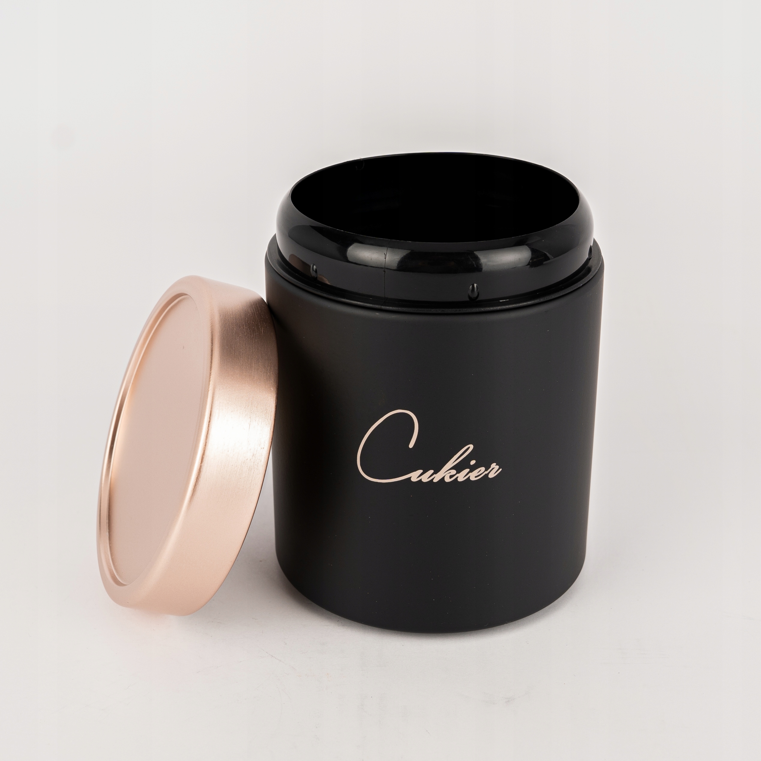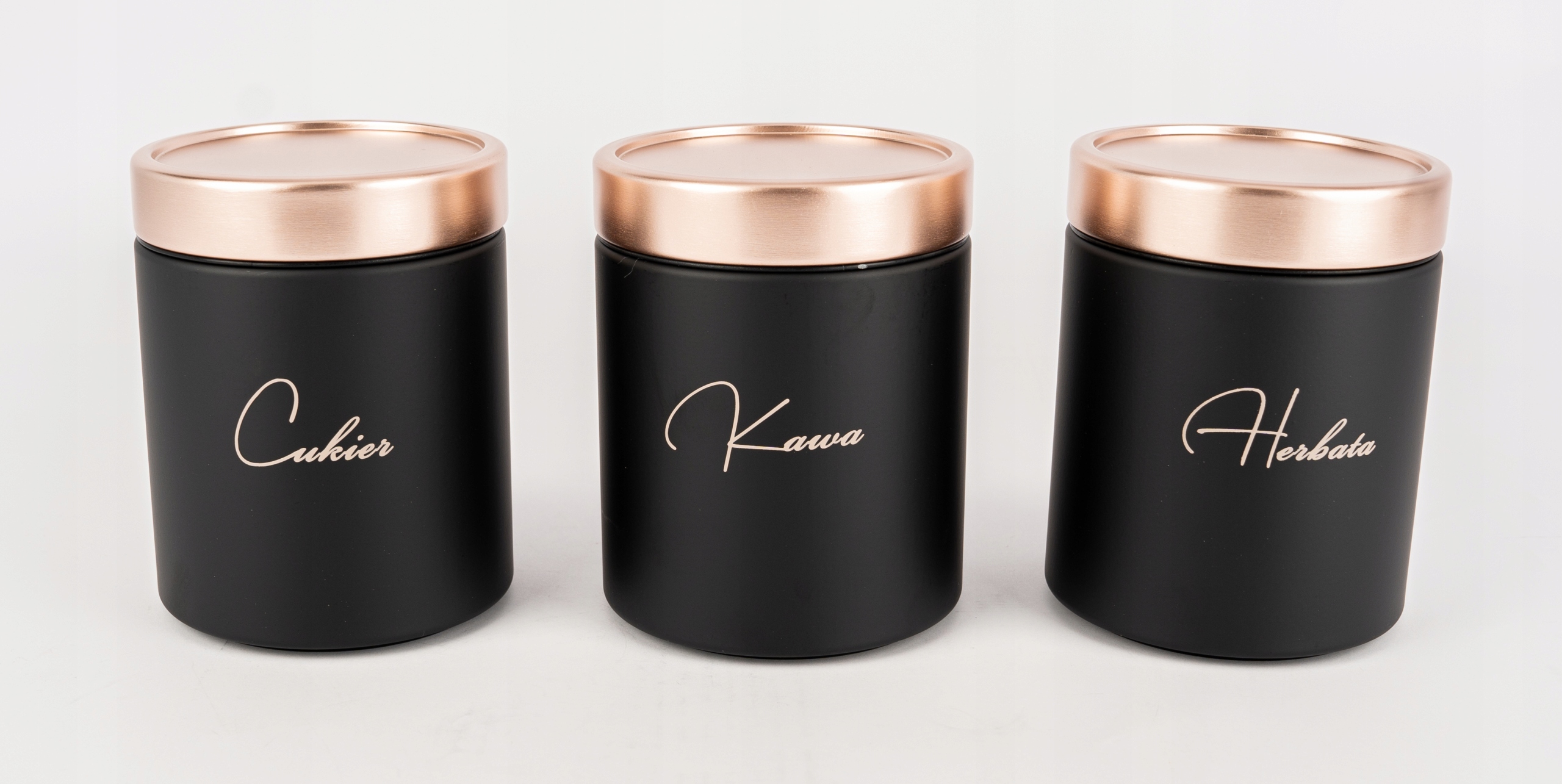 Набір прикрашений польськими написами: Sugar, Coffee, Tea, що робить його дуже легким у використанні. У набір входить 3 банки з високоякісної сталі з порошковим покриттям чорного матового кольору. Кришки модного кольору Рожеве золото.