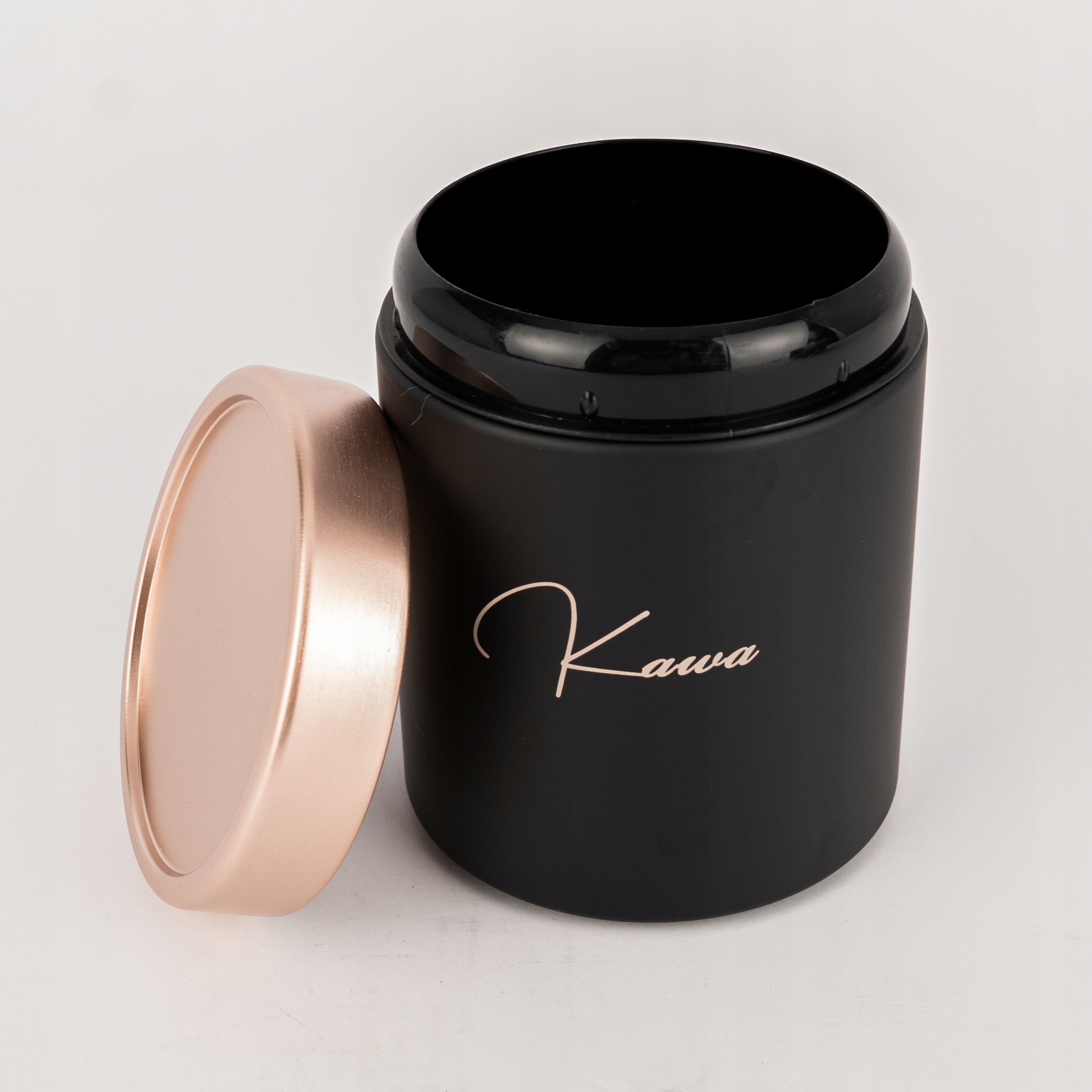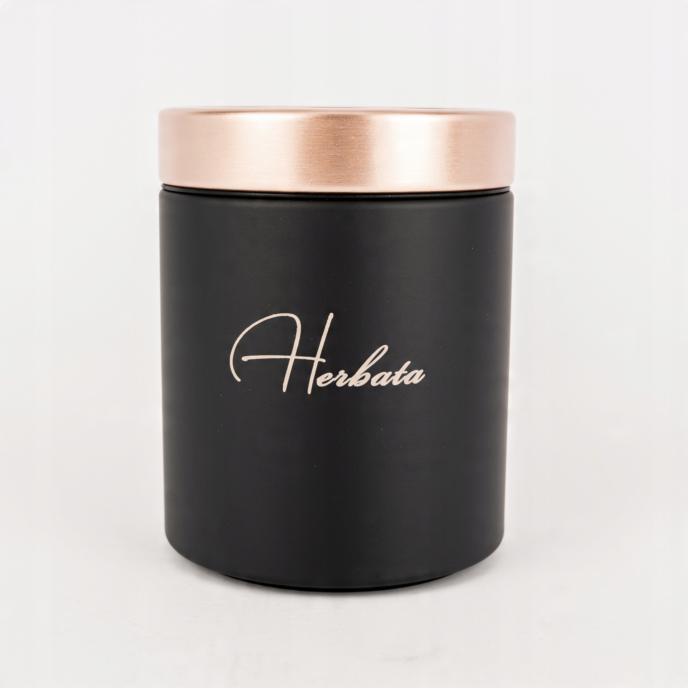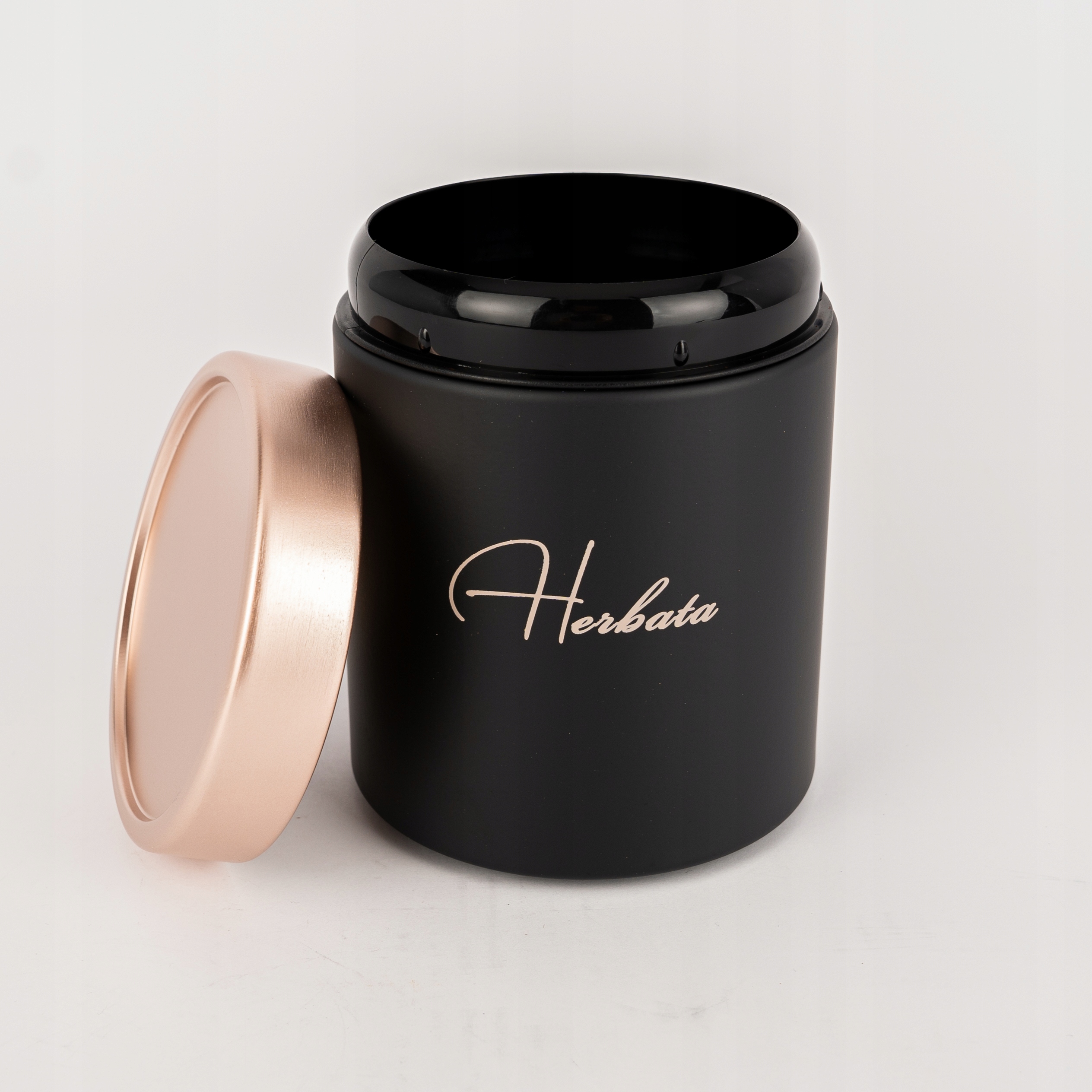Набір прикрашений польськими написами: Sugar, Coffee, Tea, що робить його дуже легким у використанні. У набір входить 3 банки з високоякісної сталі з порошковим покриттям чорного матового кольору. Кришки модного кольору Рожеве золото.