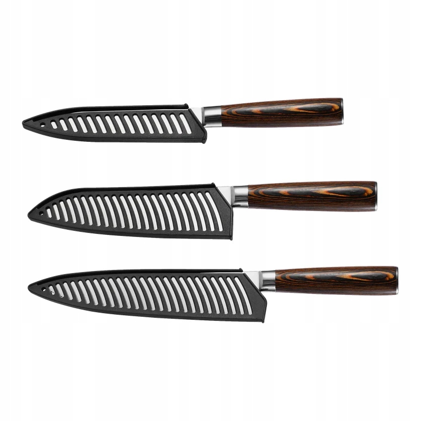Кожен ніж у наборі оснащений спеціальним пластиковим чохлом, який ефективно захищає лезо від пошкоджень і забезпечує додатковий захист від випадкових порізів. p>