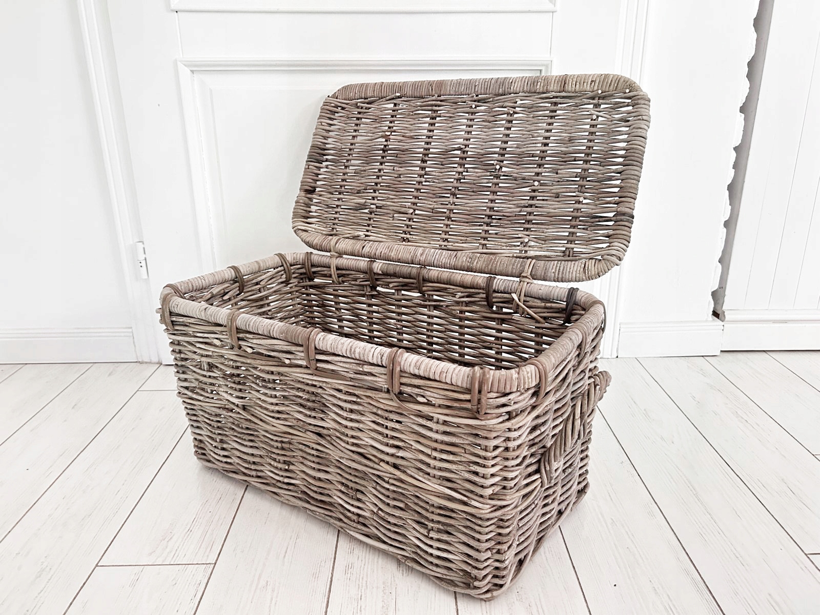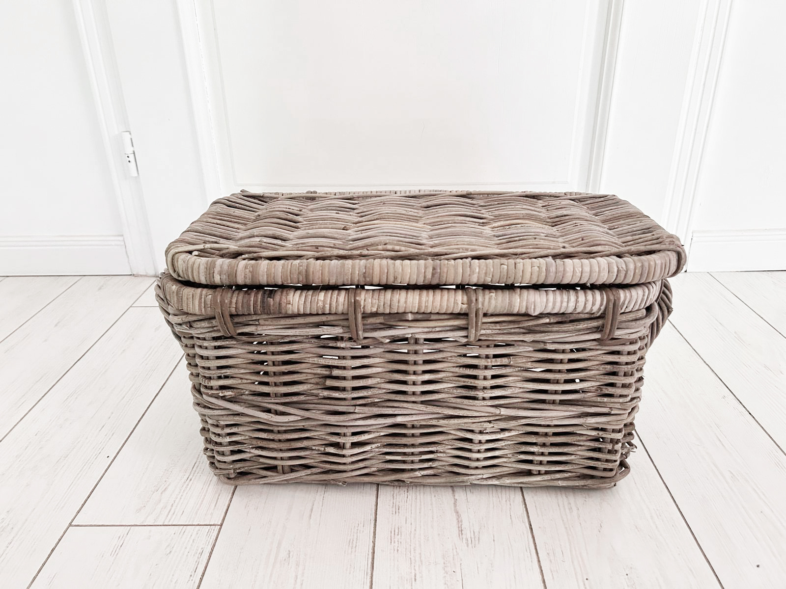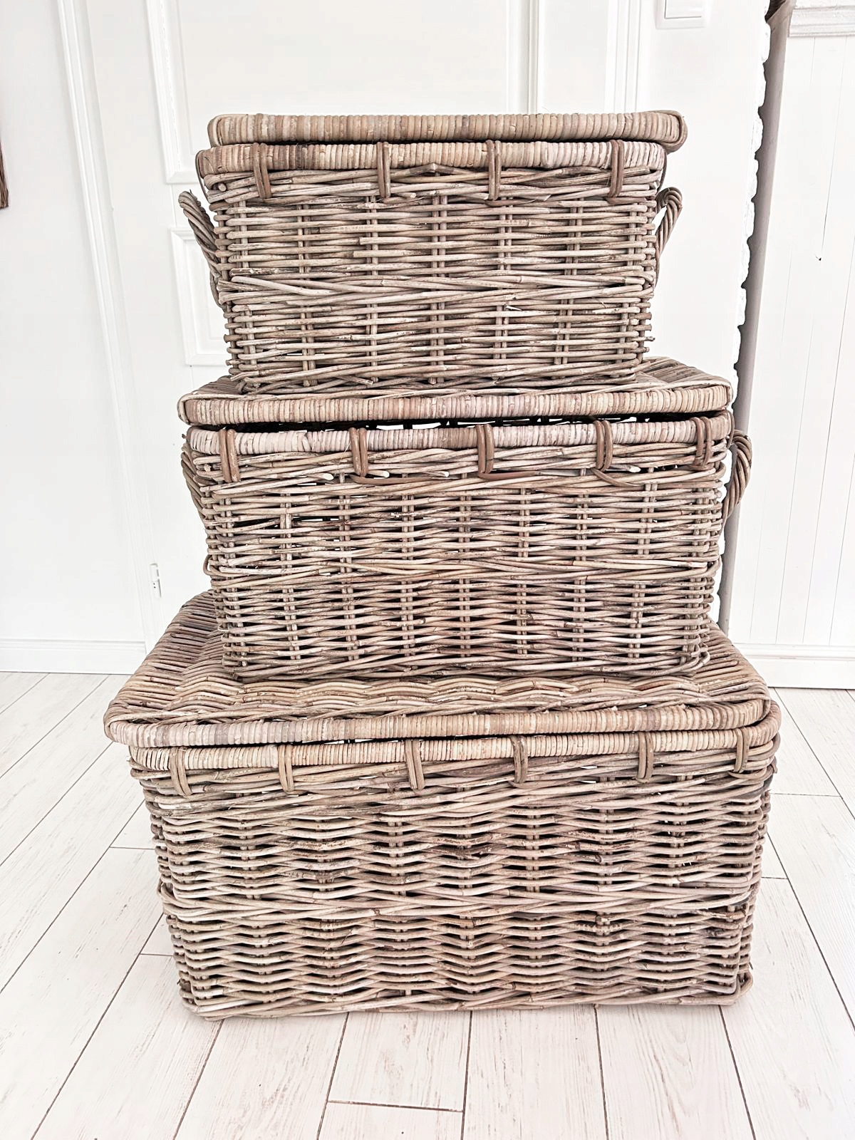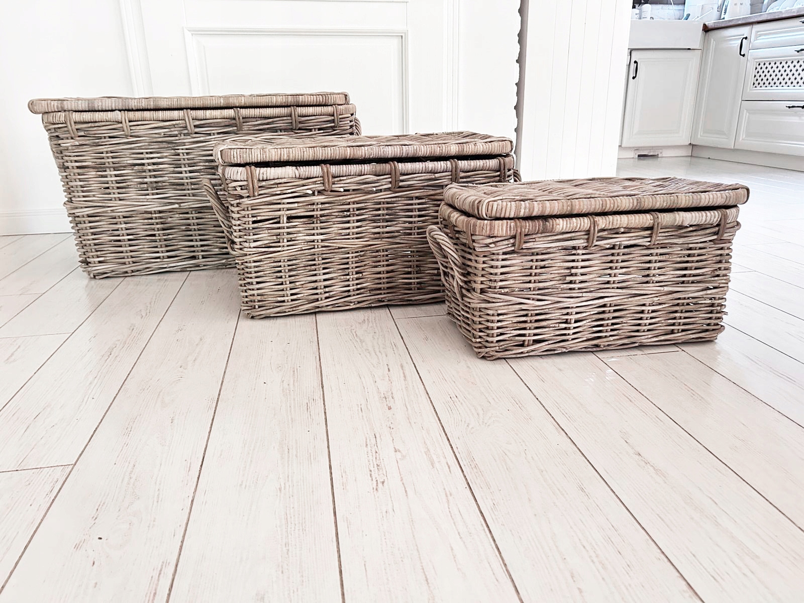 Набір трьох сільських скринь, Гемптонські кружки, виготовлені з ротанга з кришкою. Він ідеально підходить для зберігання ковдр, подушок, звичайно, його також можна використовувати для інших цілей. Він також ідеально знайдеться як багажник для іграшок у дитячій кімнаті або як ліжковий стіл у спальні. Зроблено вручну, слід пам’ятати, що це природний продукт, а колір може бути трохи . Видовище.