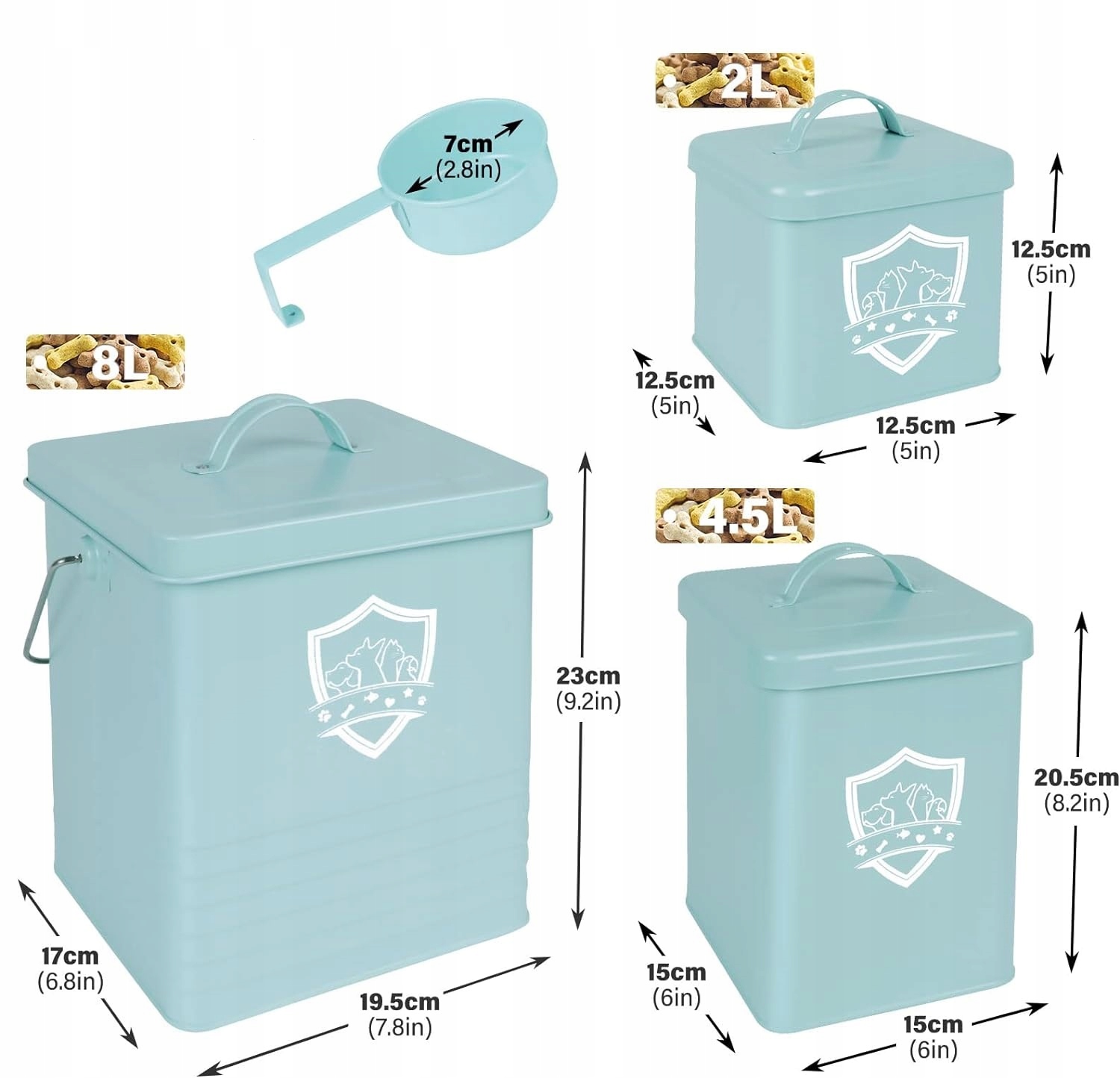 Набір контейнерів для зберігання корму та ласощів для тварин. Контейнери дуже міцні, всі контейнери зроблені з металу. Кришка великого контейнера (8л) має ущільнювач, який робить контейнер герметичним і захищає вміст контейнера від вологи.