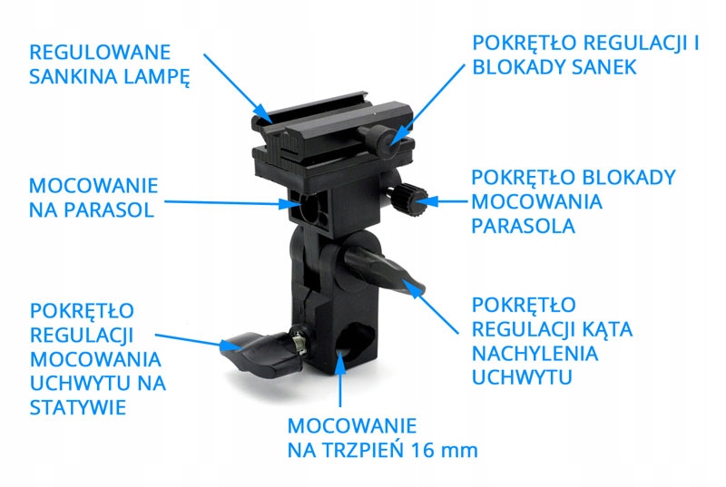✔ Універсальний тримач дозволяє встановити системну лампу/спалах. Завдяки тримачу зовнішній спалах не спалахує паралельно оптичній осі об’єктива. Тримач також має кріплення для фотографічної парасольки, що дає нам більший контроль і можливість змінювати випромінюване світло.