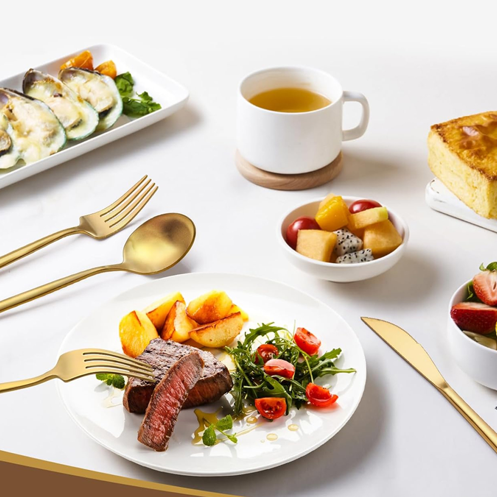Надзвичайно елегантний і повний набір столових приборів на 6 персон, який змінить ваші повсякденні трапези та урочисті вечірки! Золотистий колір додає блиску, а нержавіюча сталь найвищої якості гарантує неперевершену довговічність. Це поєднання чудового дизайну, комфорту використання та надзвичайної довговічності.