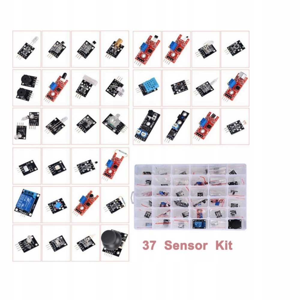 - ✅ Набір із 37 сенсорних модулів у коробці — ідеально підходить для Arduino та навчання електроніціБагатий набір із 37 сенсорних модулів — чудовий вибір для новачків і любителів, які цікавляться електронікою та мікроконтролерами. Тут ви знайдете датчики для визначення температури, світла, руху, звуку, магнітного поля та багатьох інших параметрів. Кожен модуль розміщено в окремому відділенні пластикової коробки, що полегшує організацію та швидкий доступ.