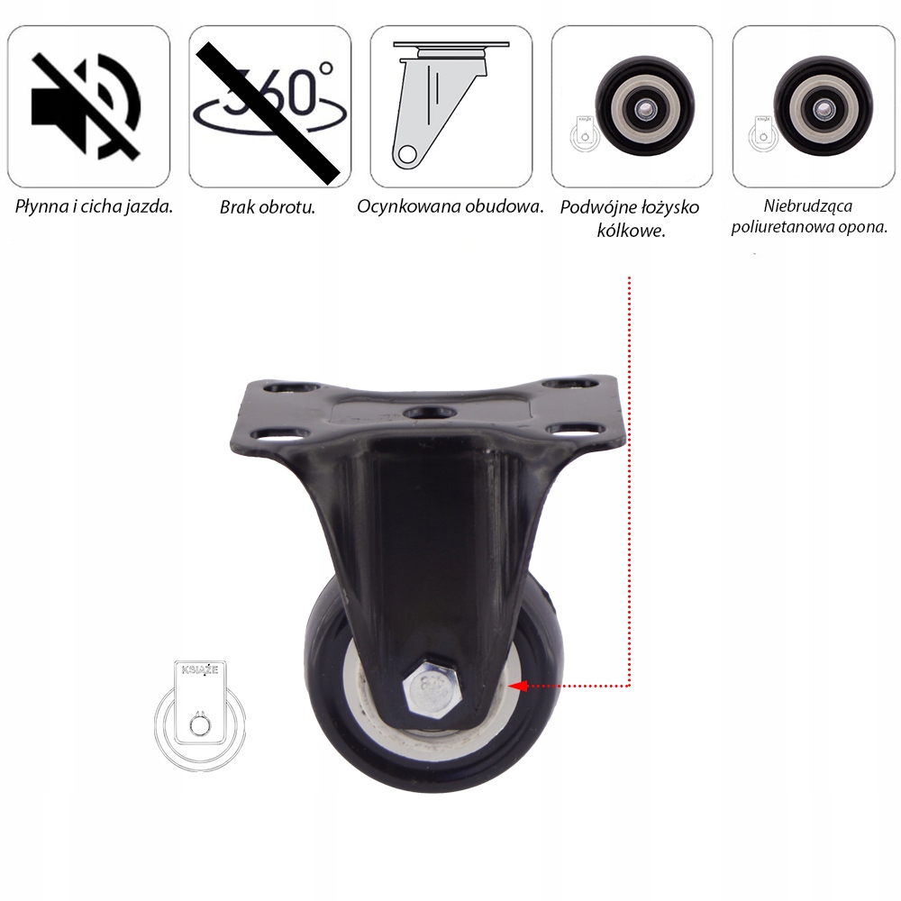 Колесо складається з поліпропіленової втулки та поліуретанової шини, що не залишає слідів, має подвійний кульковий підшипник.