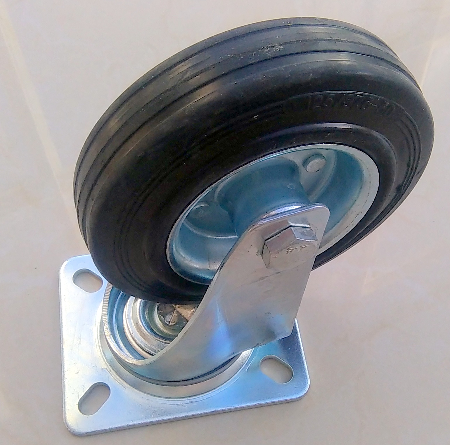 Колеса встановлені на т.зв Пластина являє собою комбінацію вилки з пресованого сталевого листа і колеса зі сталевою втулкою і шиною з суцільної чорної гуми. Поворотна головка вилки має подвійні підшипники і захищена від бруду спеціальним пиловим ущільнювачем.Всі металеві елементи набору покриті антикорозійним хромоцинковим покриттям. Гальмо блокує колесо та головки.