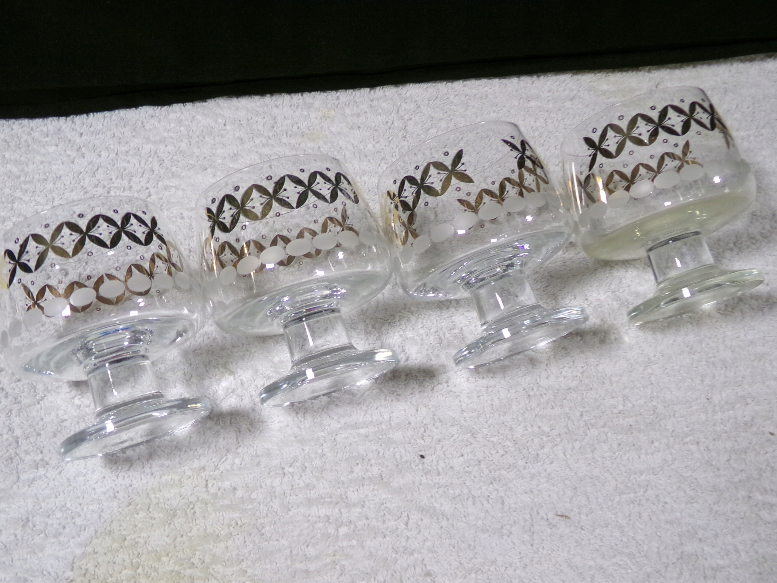 набір із 4 позолочених скляних чашок з висотою 9,5 см, середній діаметр 7 см, ємність 200 мл, вагою 0,72 кг. Дуже хороший стан збережений, без пошкоджень.