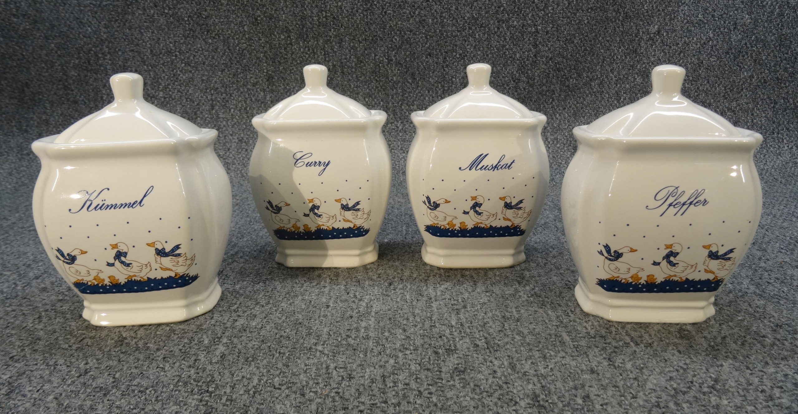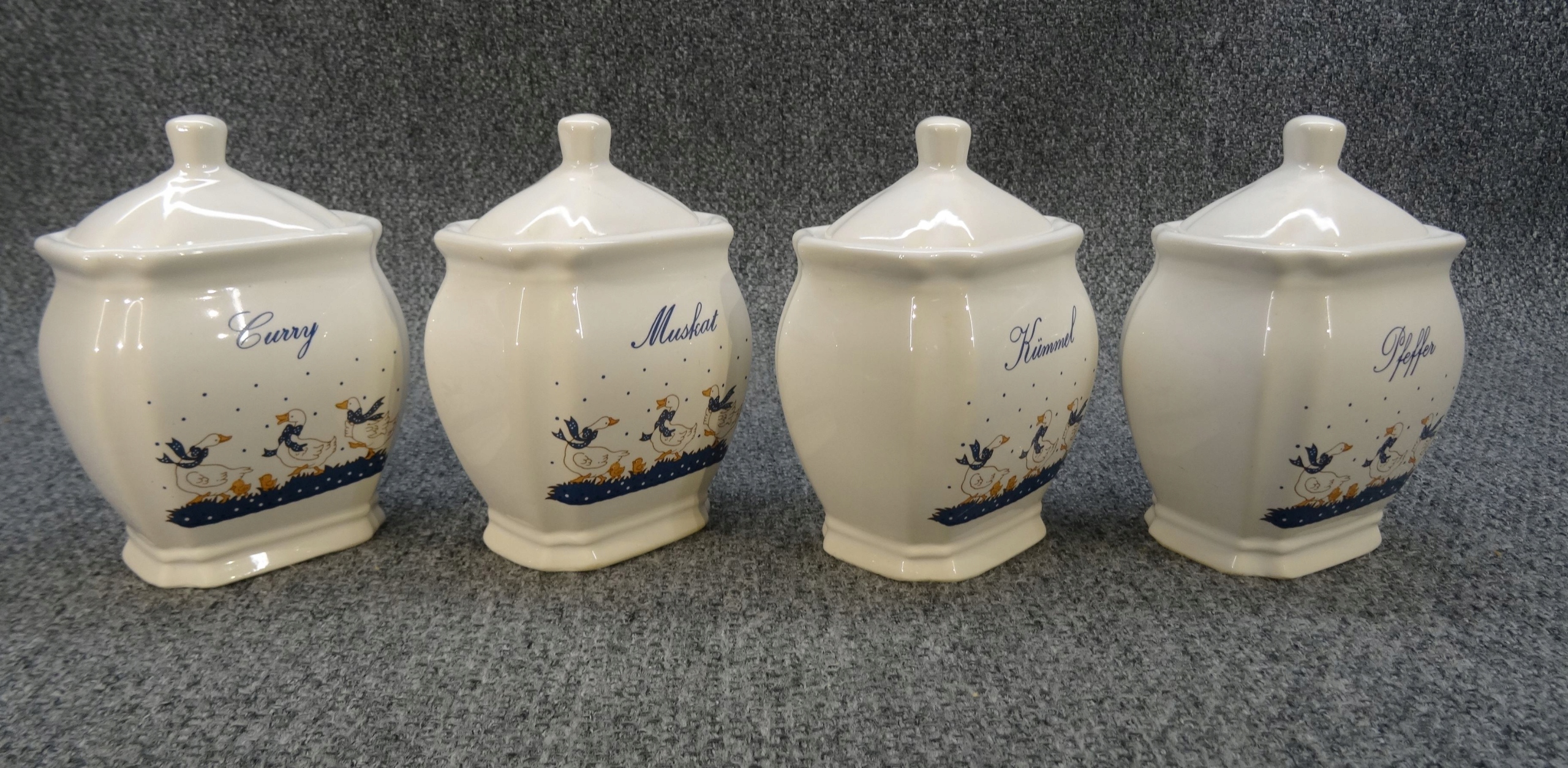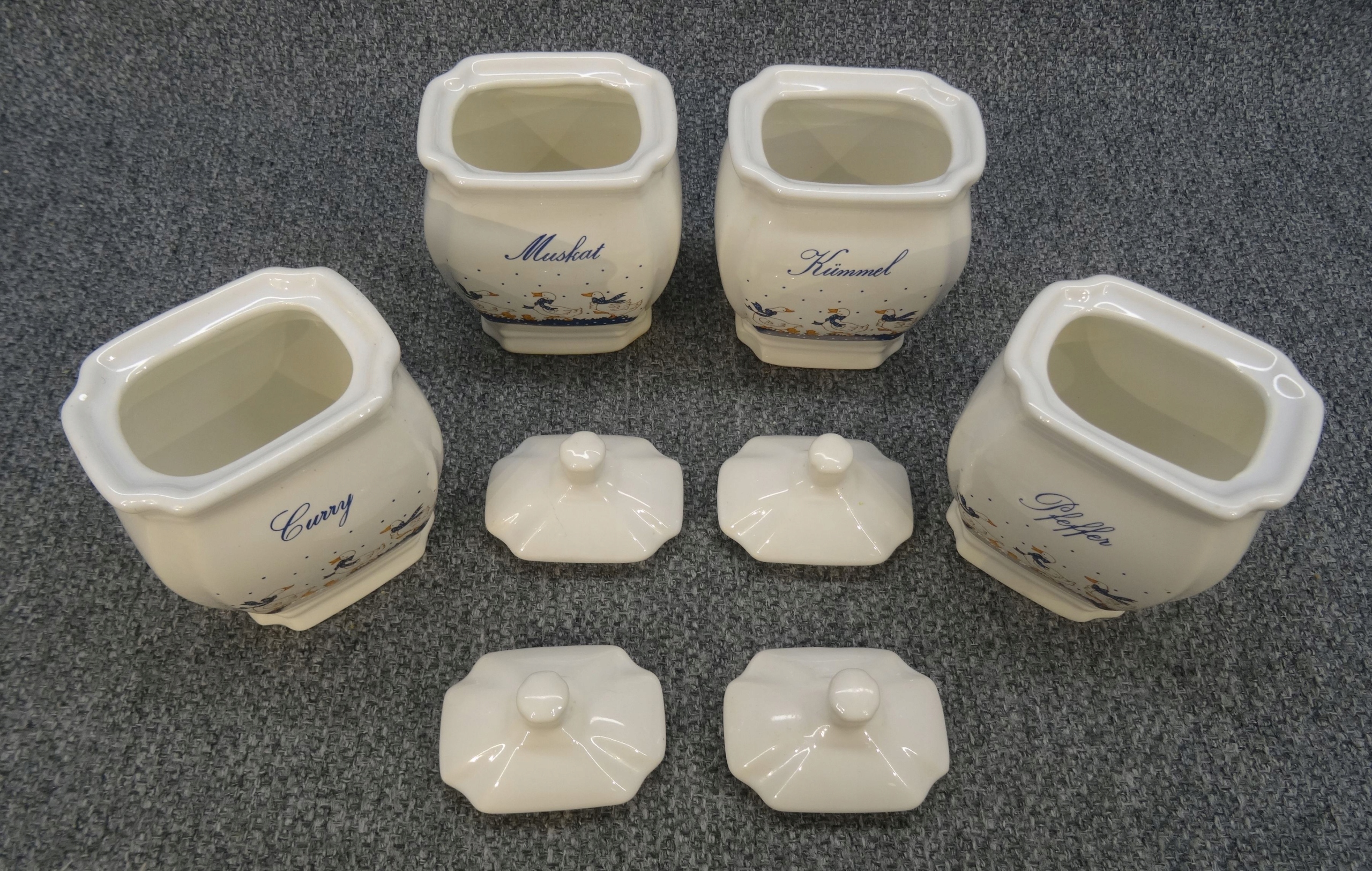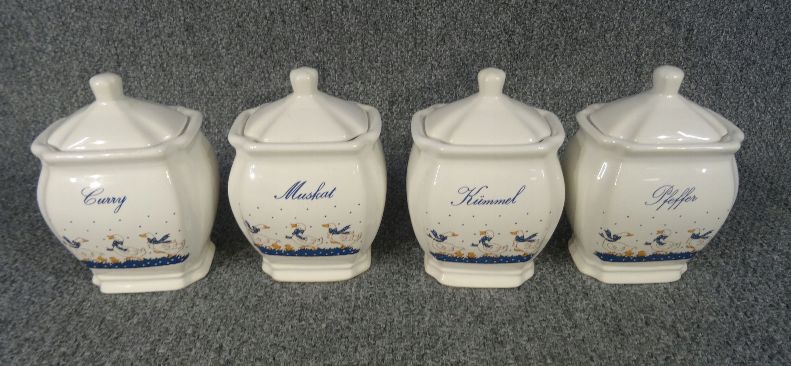Набір з 4 німецьких порцелянових ємностей для спецій - гусячий малюнок. контейнери; kummel - кмин, pfeffer - перець, muscat - мускатний горіх, curry - каррі