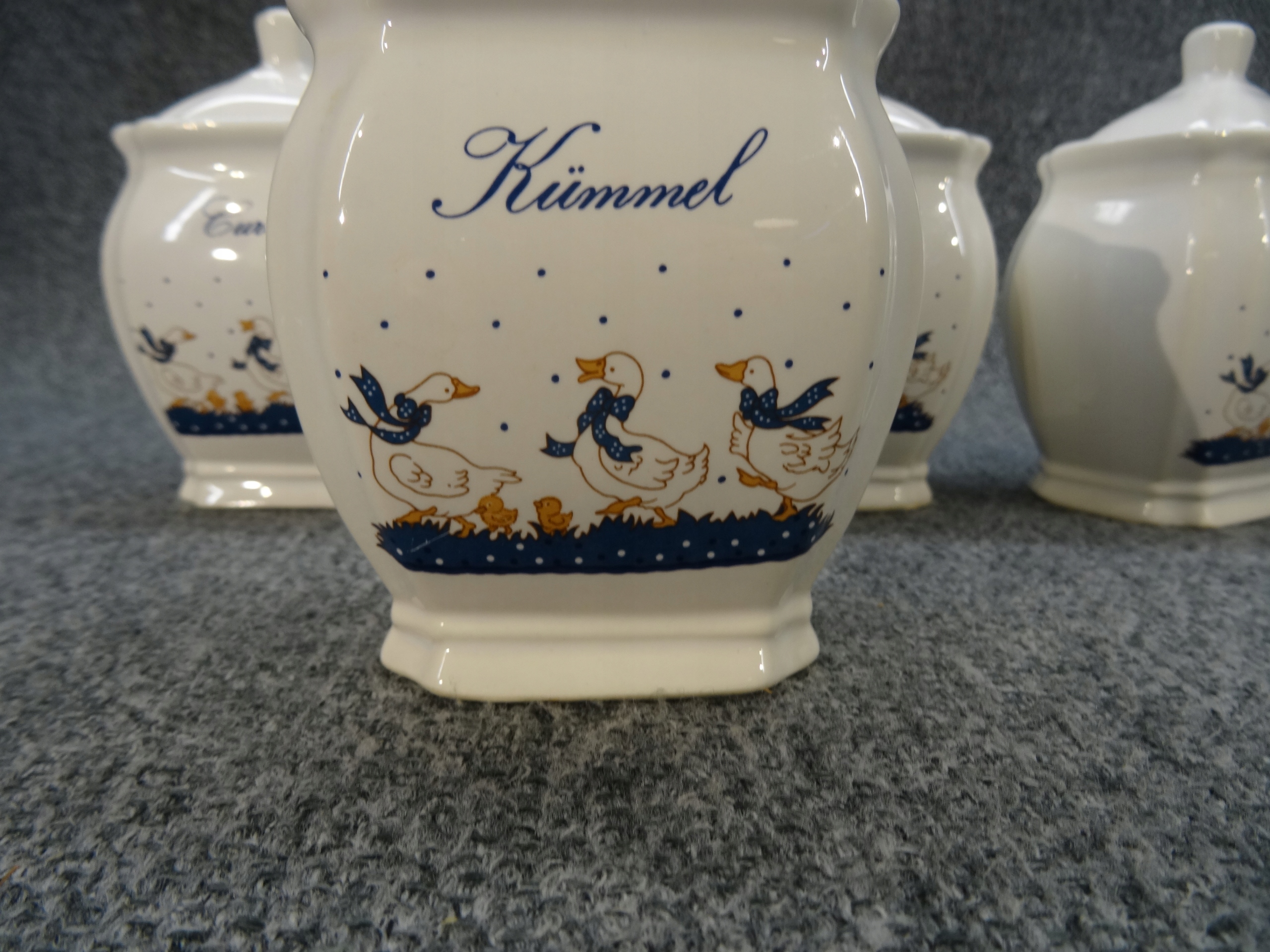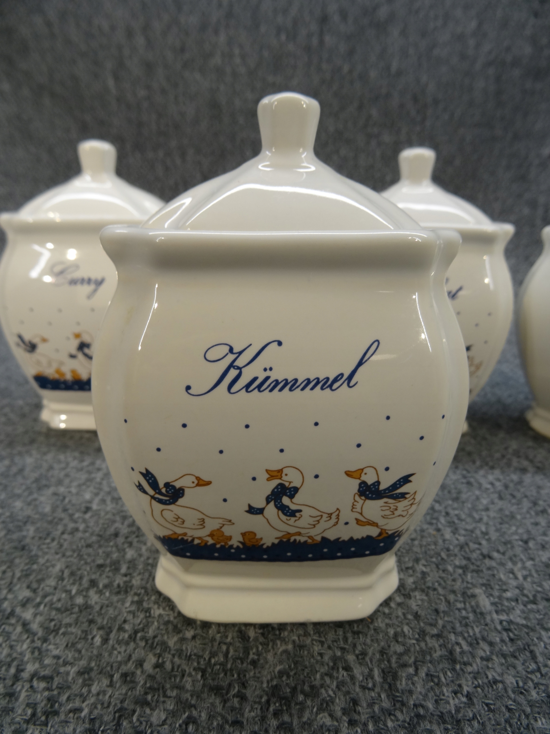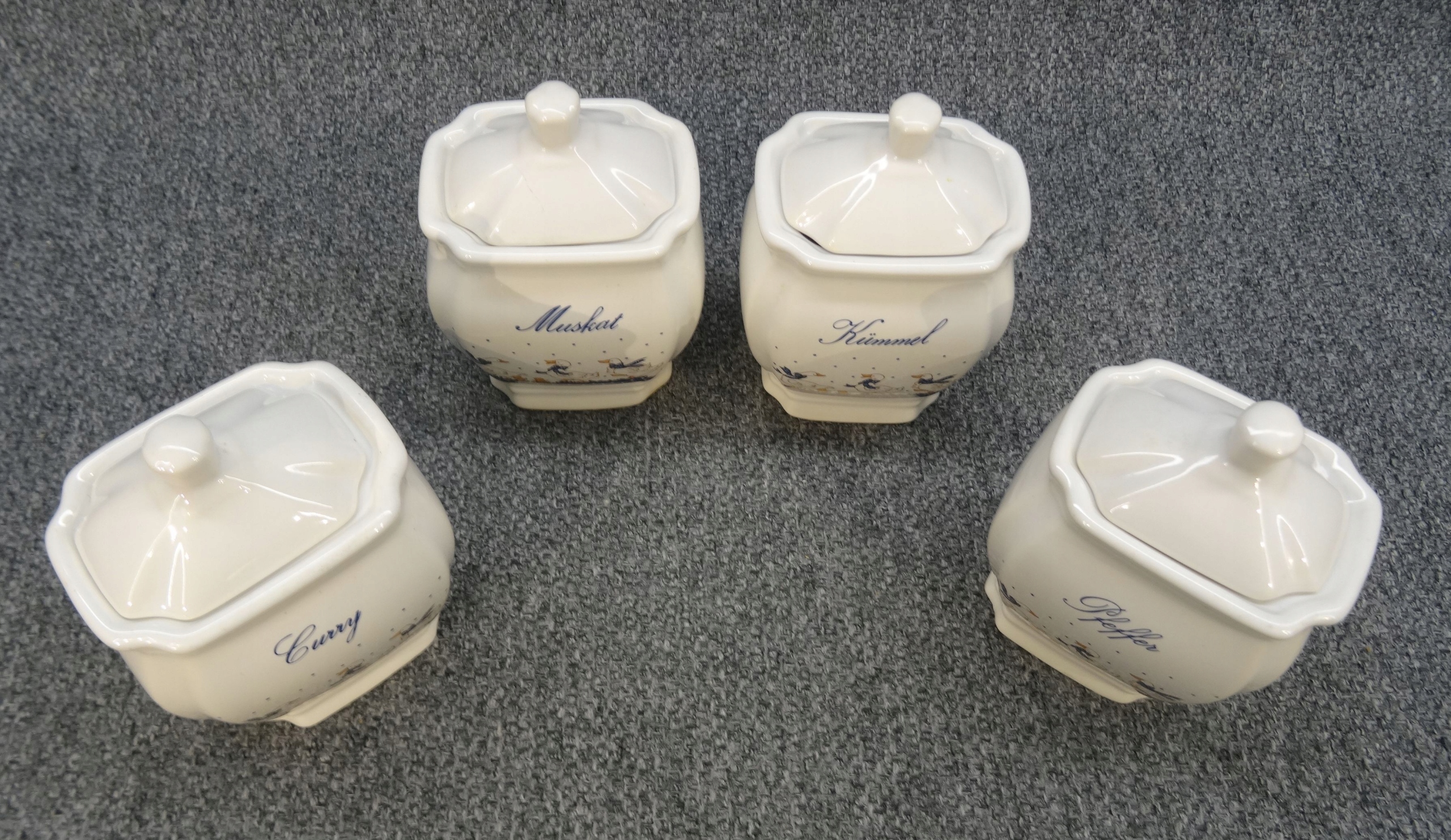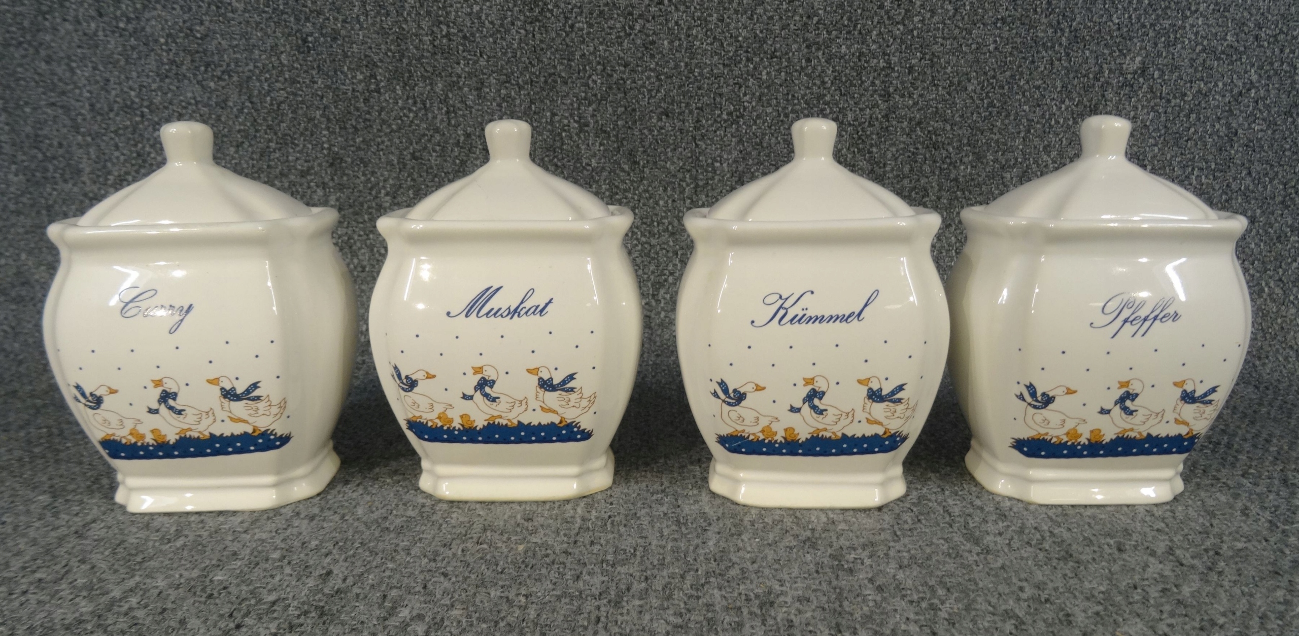 Набір з 4 німецьких порцелянових ємностей для спецій - гусячий малюнок. контейнери; kummel - кмин, pfeffer - перець, muscat - мускатний горіх, curry - каррі