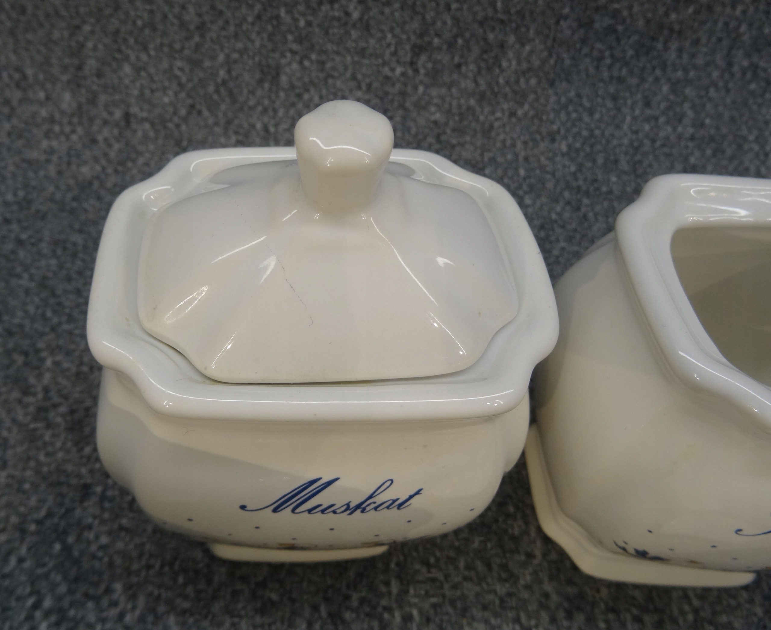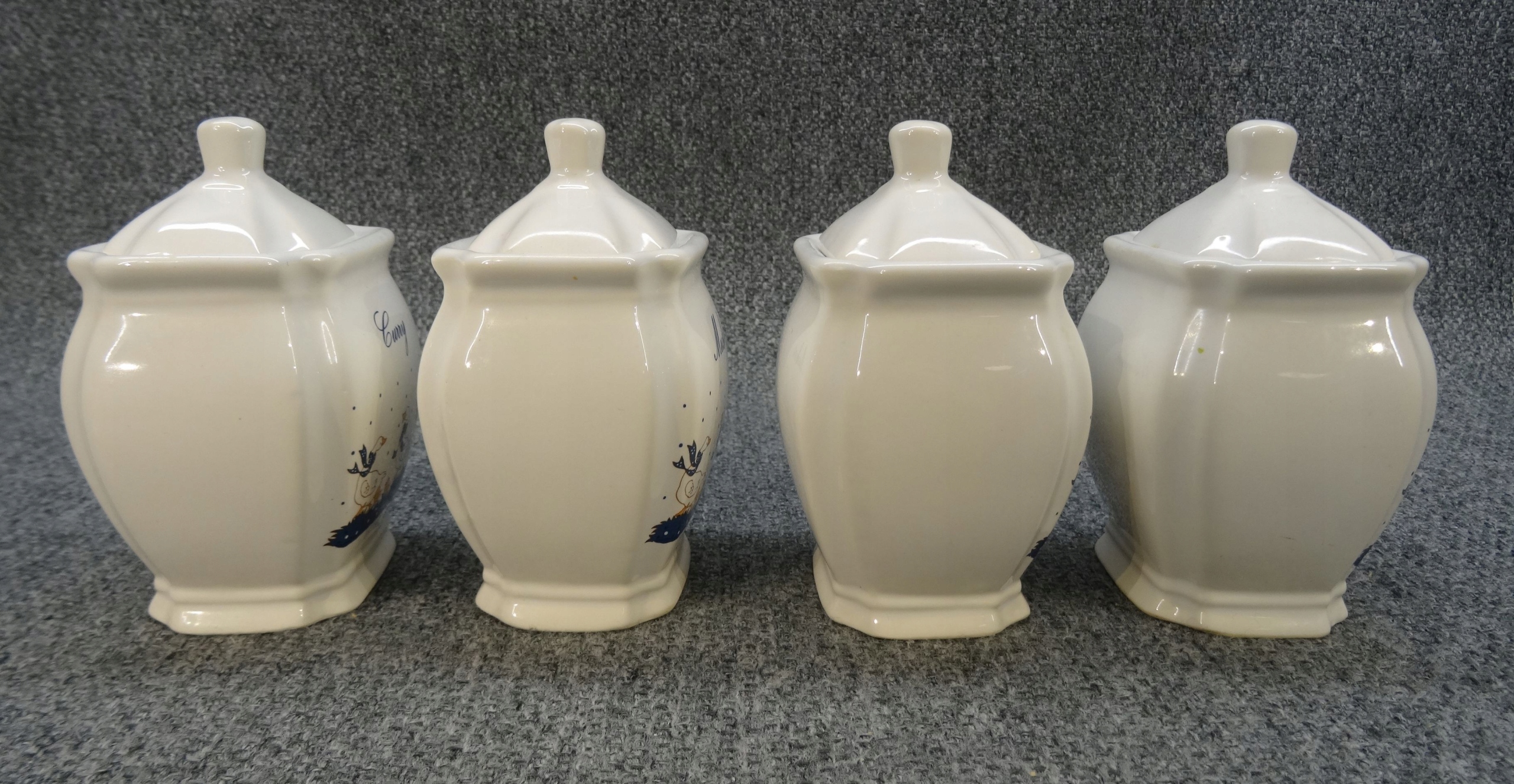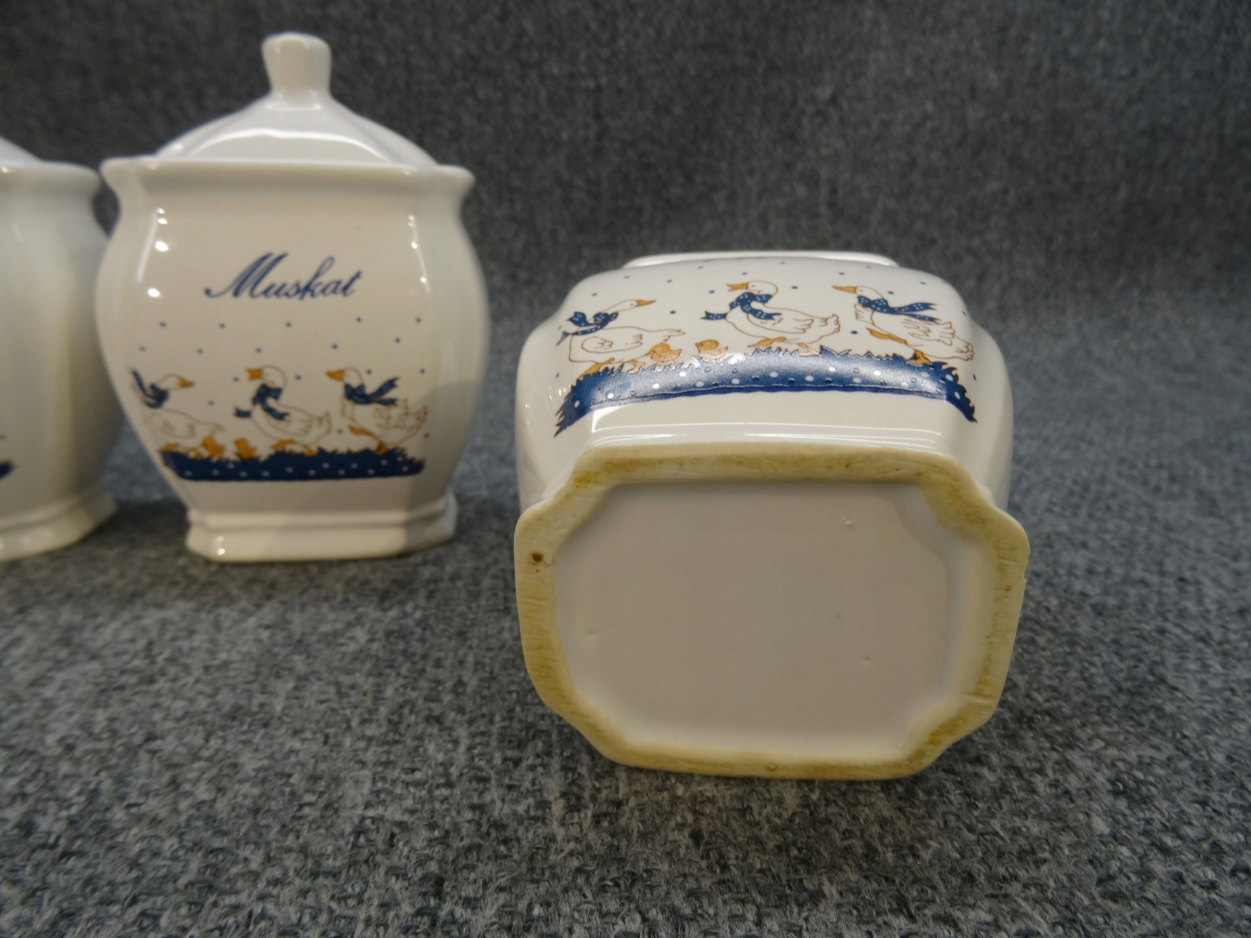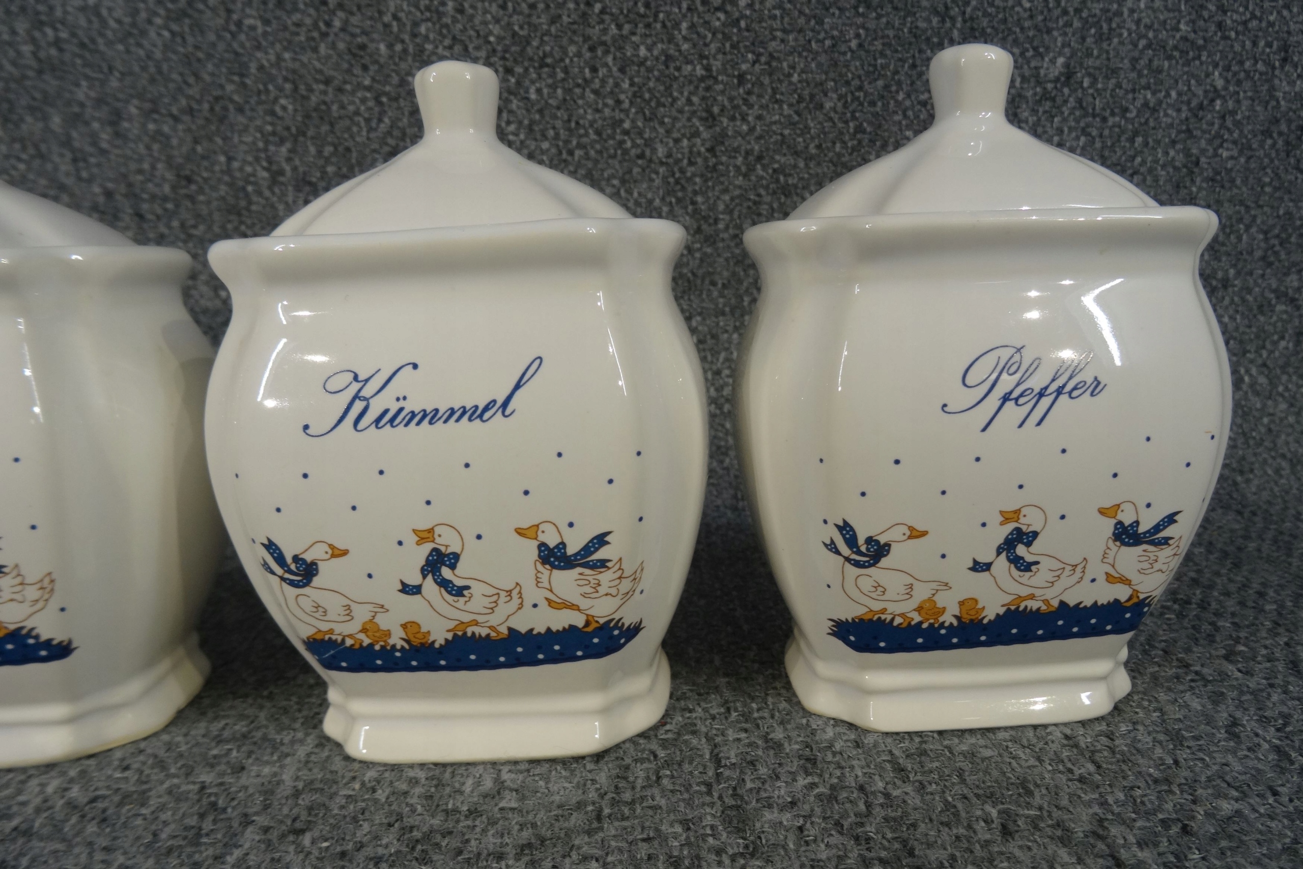 Набір з 4 німецьких порцелянових ємностей для спецій - гусячий малюнок. контейнери; kummel - кмин, pfeffer - перець, muscat - мускатний горіх, curry - каррі