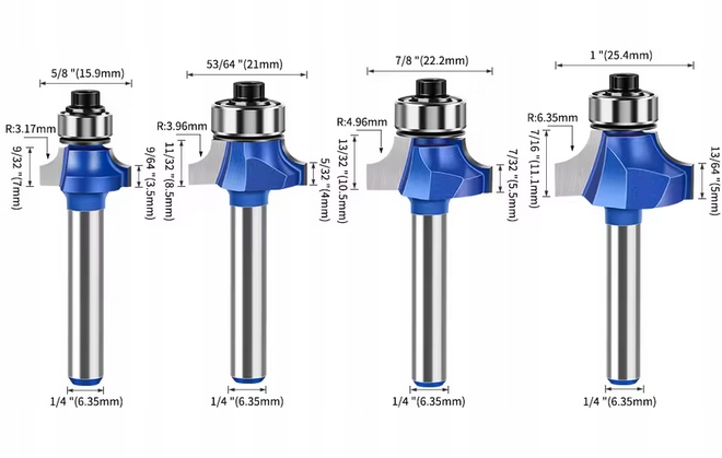 НАБІР З 4 РАДІАЛЬНИХ ФРЕЗІВ ДЛЯ ЗАОКРУГЛЕННЯ КРАНІВ хвостовик 6,35 мм 1/4"