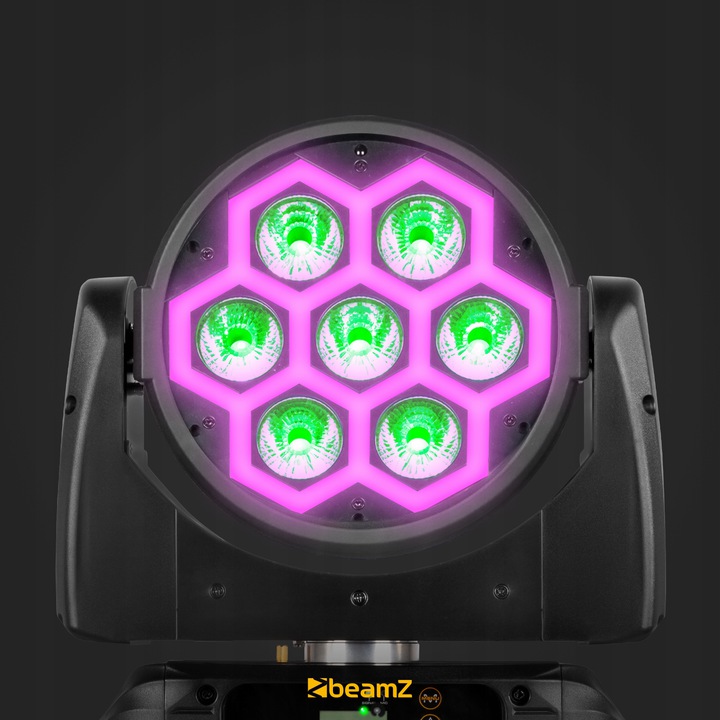 7 світлодіодів FUZE712 забезпечують безпрецедентну кількість світла. Світлодіоди — це світлодіоди 4 в 1 червоного, зеленого, синього та білого кольорів. Змішуючи ці кольори або граючи з інтенсивністю, ви можете створити величезну кількість кольорів, у тому числі пастельні, за допомогою цієї рухомої головки.