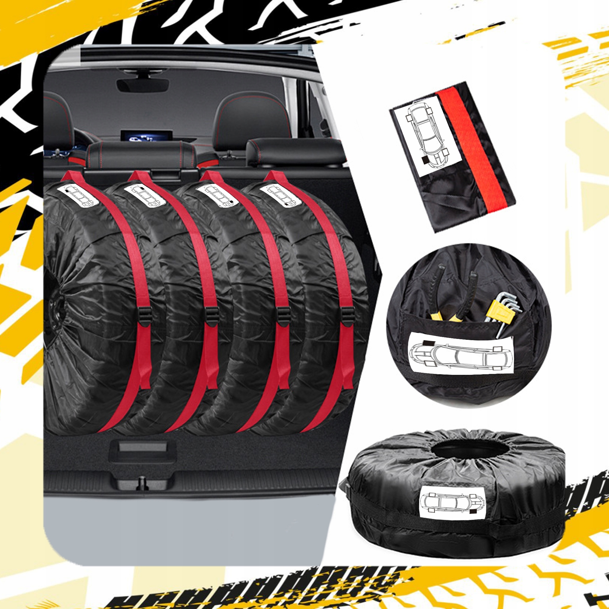 - Практичні позначки: чохли мають ярлики, що позначають положення коліс, що полегшує їх ідентифікацію та встановлення в потрібному місці під час наступної заміни шин. Завдяки цьому ви заощадите час і уникнете помилок під час складання.