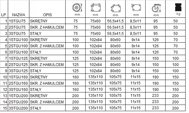 Набір складається з чотирьох коліс, оснащених кріпленням тарілки. Комплект включає два постійних наборів з кодом 3STGU200 (пункт 15 в таблиці) та два колеса кручення з кодом 1Stgu200 (пункт 13 в таблиці). Вага набору 10,07 кг.