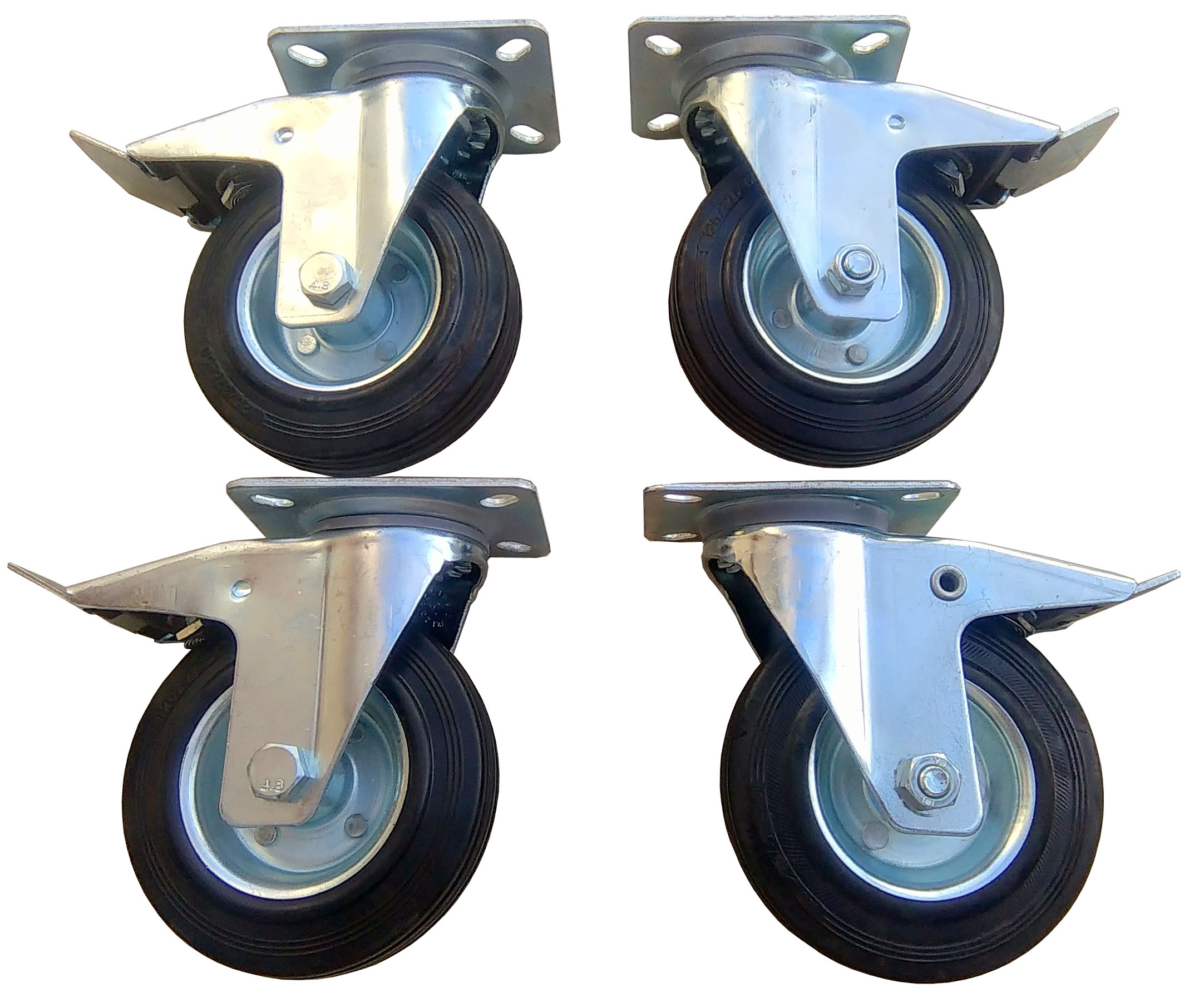 Колеса, встановлені на т.зв. пластина являє собою комбінацію вилки, виготовленої з пресованого сталевого листа, і колеса зі сталевою втулкою та суцільною чорною гумовою шиною. Всі металеві елементи комплекту покриті антикорозійним цинковим покриттям.