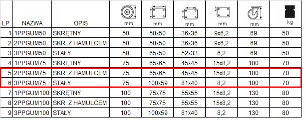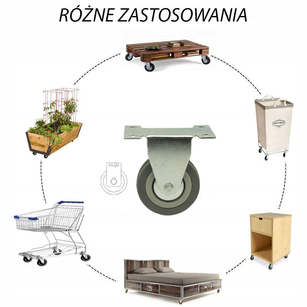 - КОЛЕСО складається з поліпропіленової втулки та немаркої гумової шини, з підшипником ковзання. Колеса мають міцність 70 кг на колесо. Вони повільно зношуються, стійкі до пошкоджень, поглинають удари та вібрацію. Вони обертаються на 360 градусів, полегшуючи маневрування меблями або коляскою. Вони плавно обертаються на твердих і гладких поверхнях, як-от бетон, з дуже невеликим тертям.