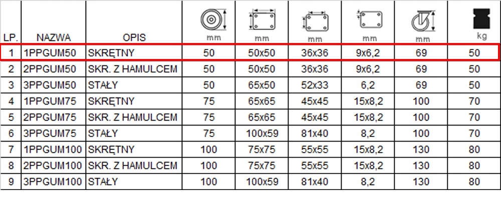У комплект входять чотири комплекти, встановлені на пластину з кодом 1PPGUM50 (в таблиці під п. 1).