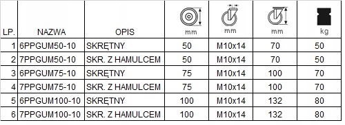 У комплект входять чотири колісні пари, встановлені на отвір за допомогою шестигранного гвинта. Кріплення комплекту з кодом 7PPGUM75-10 (у таблиці під номером 4) за допомогою гвинта M10x30.