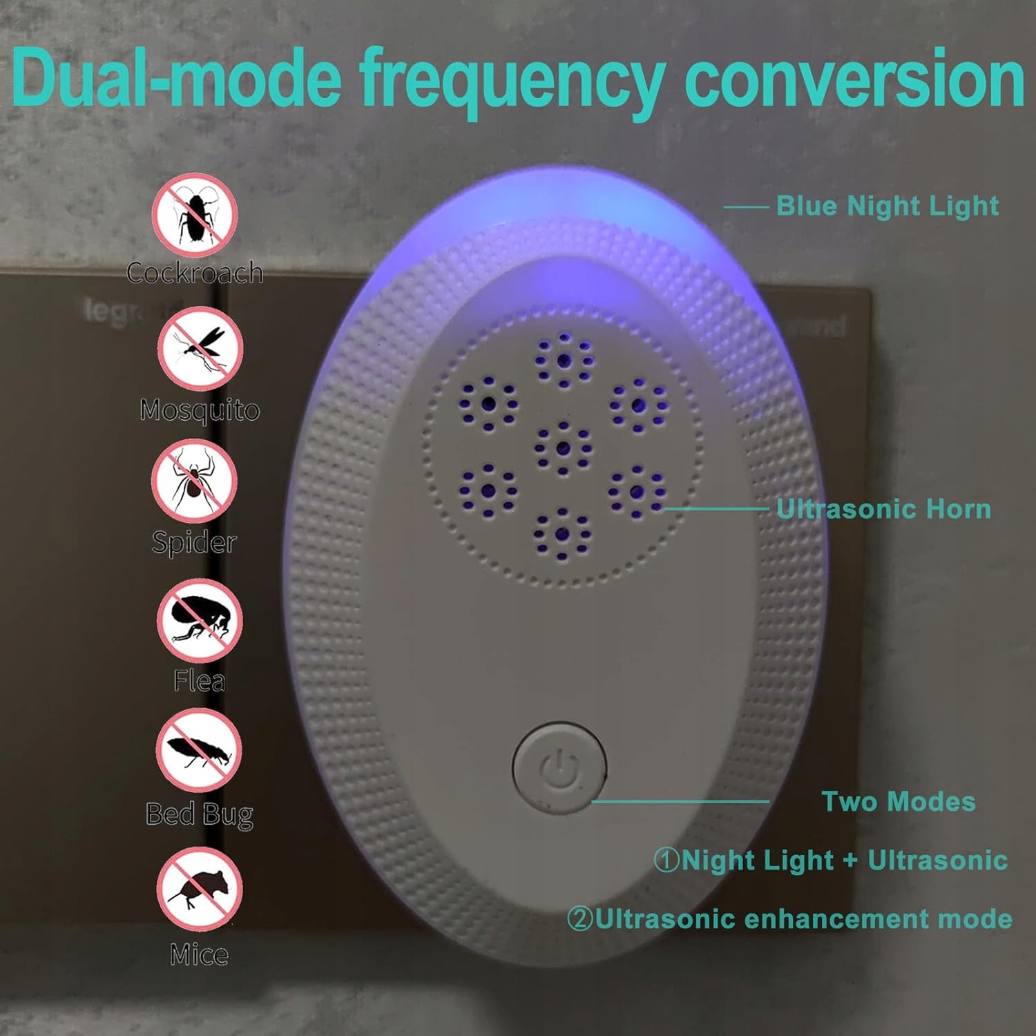 Набір із 4 ультразвукових пристроїв, призначених для відлякування комарів, мишей, щурів, павуків, мух, тарганів та інших небажаних комах і гризунів. Випромінювані ультразвукові хвилі не чутні для людей і більшості домашніх тварин, і водночас вони створюють середовище, несприятливе для шкідників, ефективно перешкоджаючи їм залишатися вдома.
