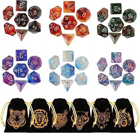 Набір із 42 кубиків для RPG та карткових ігор, виготовлений із міцного акрилу. Містить 6 наборів по 7 кубиків інтенсивних кольорів і блискучого покриття. Ідеально підходить для таких ігор, як DND, MTG тощо, дозволяючи створювати різноманітні набори кубиків. У набір входять такі види: W4, W6, W8, W10 (0-9 і 00-90), W12, W20. Кубики характеризуються точною опрацюванням, гладкою поверхнею та розбірливими цифрами. У набір входять практичні оксамитові сумки для безпечного зберігання та зручного транспортування. 🎲✨