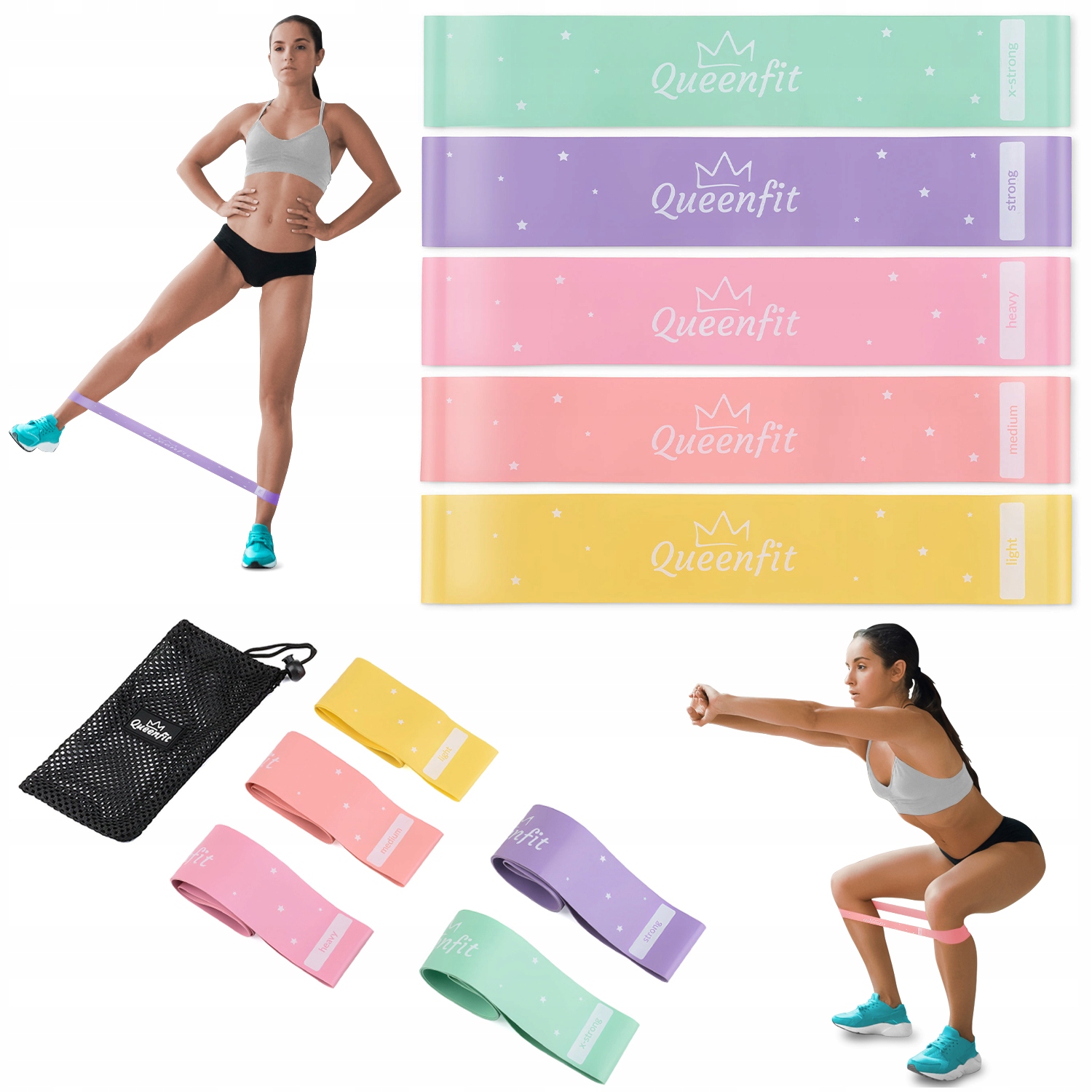 Набір Queenfit, що складається з чотирьох «міні-стрічок», дозволяє легко регулювати рівень опору для певних частин тіла та рівня тренованості тіла. Враження зміни опору є результатом більшого чи меншого розтягування гумових стрічок. Що більше сили ви докладаєте до розтягування, то більша вага опору.