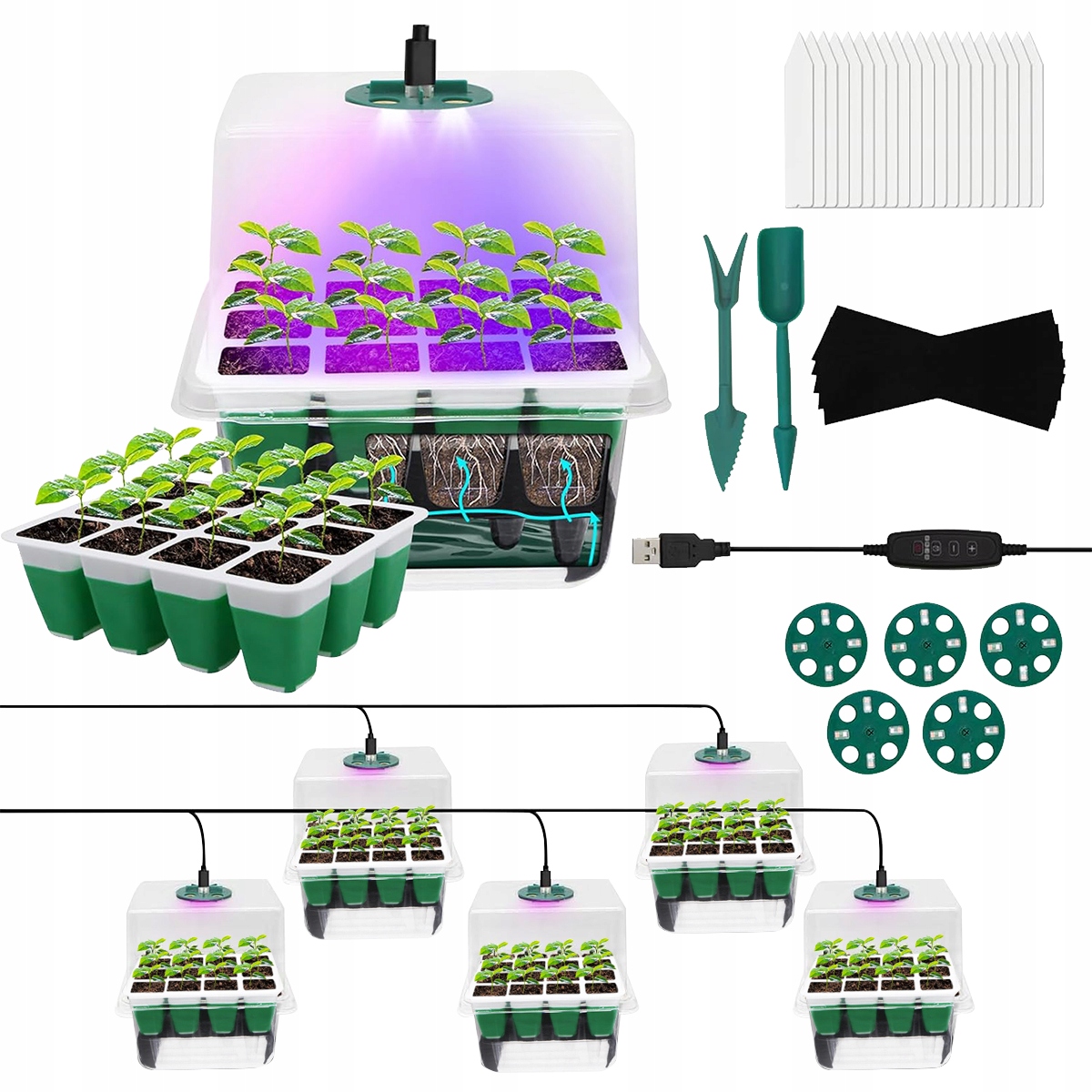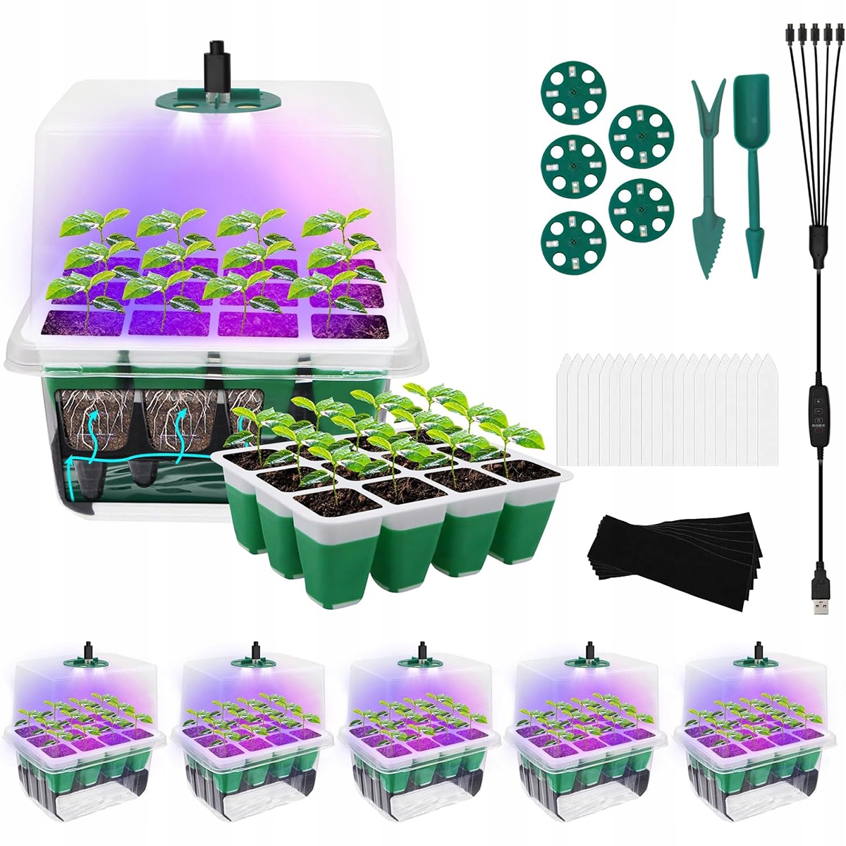 Внутрішній тепличний розмножувач зі світлодіодним освітленням, 5 шт., 60 комірок, міні-теплиця з самополивом, багаторазові силіконові лотки для проростання для висаджування насіння в приміщенні