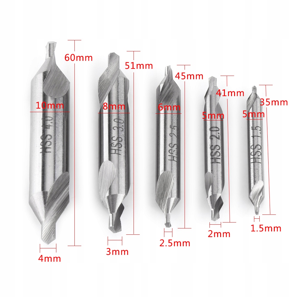 Набір із 5 шт. центральних свердел із швидкорізальної сталі, кут 60 градусів 1,5/2/2,5/3/4 мм