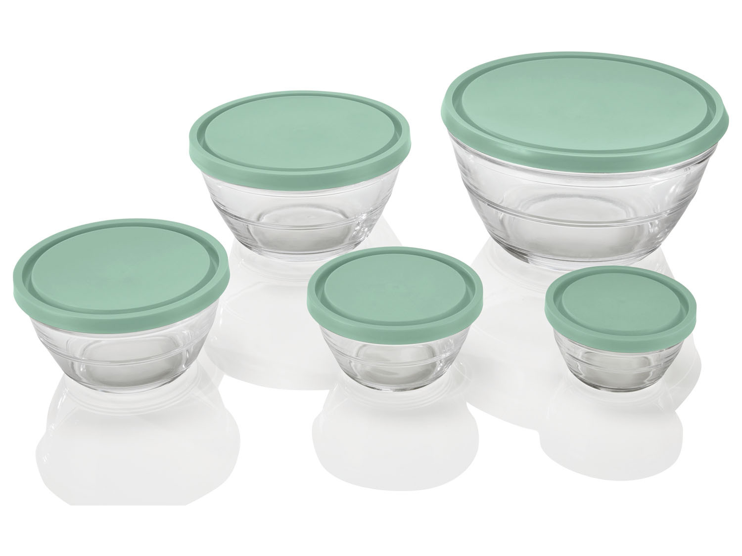 Набір скляних мисок із зеленими кришками з діаметром від 9 до 17 см. Чаші мають потужність від 210 до 2320 мл. Максимальна температура їх використання - 70 ° С. Чаші були виготовлені з міцного та прозорого скла. Завдяки суворо сусіднім кришам, ви захищаєте збережену їжу від забруднення або ароматів у холодильнику.