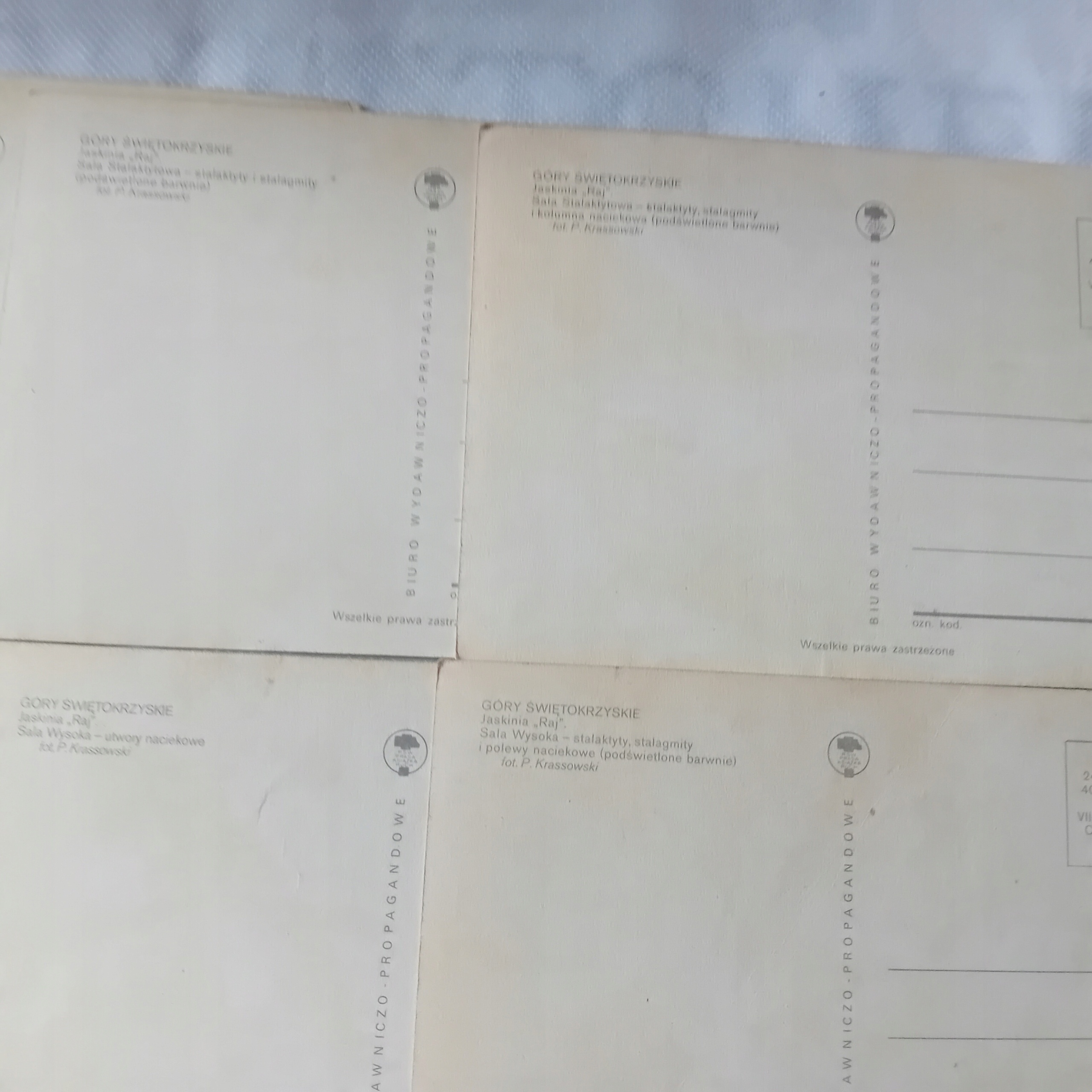 Я продам набір з 6 листівок: гори świętokrzyskie, Raj Cave. Видавець: Kaw, 1973. Фотографії: П. Крассовський. Циркуляція 40 000 примірників. На фотографіях показано: Висока кімната - сталактити, сталагміти та інфільтративне покриття. Інфільтратні творіння печерної стелі. "Арфа" в камері Зоміска. Зал сталактиту. Зал сталактиту. Високий зал - інфільтратні творіння. Листівки без обігу. Досить хороший стан - зігнуті кути, листівки пожовтіли на зворотному. Ціна призначена для набору - 6 штук