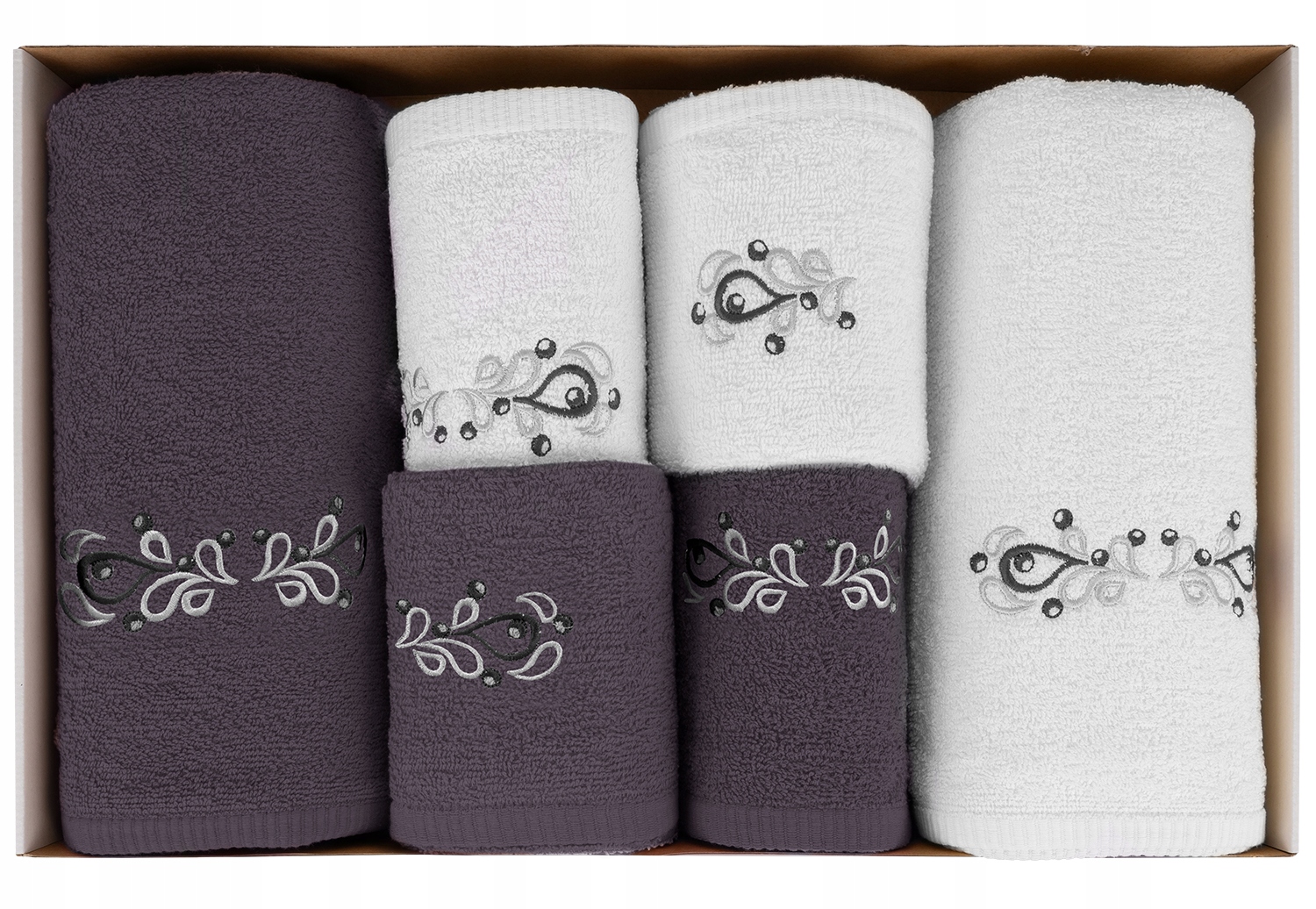 Ціле упаковане в елегантну подарункову скриньку з вікном , завдяки якому рушники винятково виглядають з самого початку. Це готова ідея подарунка - практична і справді стильна.