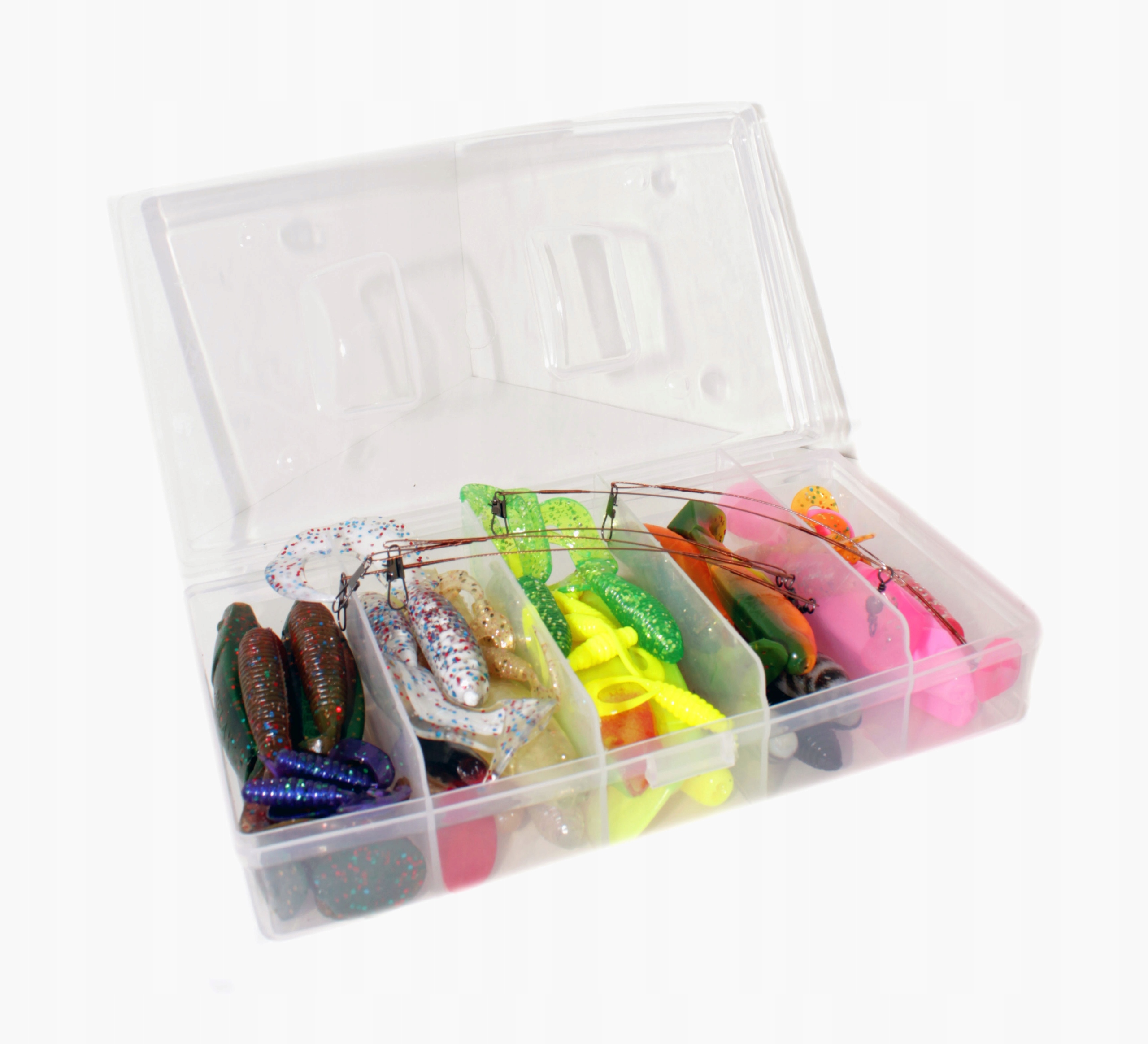 Весь набір упакований в коробку для рибальських приналежностей на 5 відділень. Коробка легка та зручна, закрита для запобігання випадковому відкриттю.
