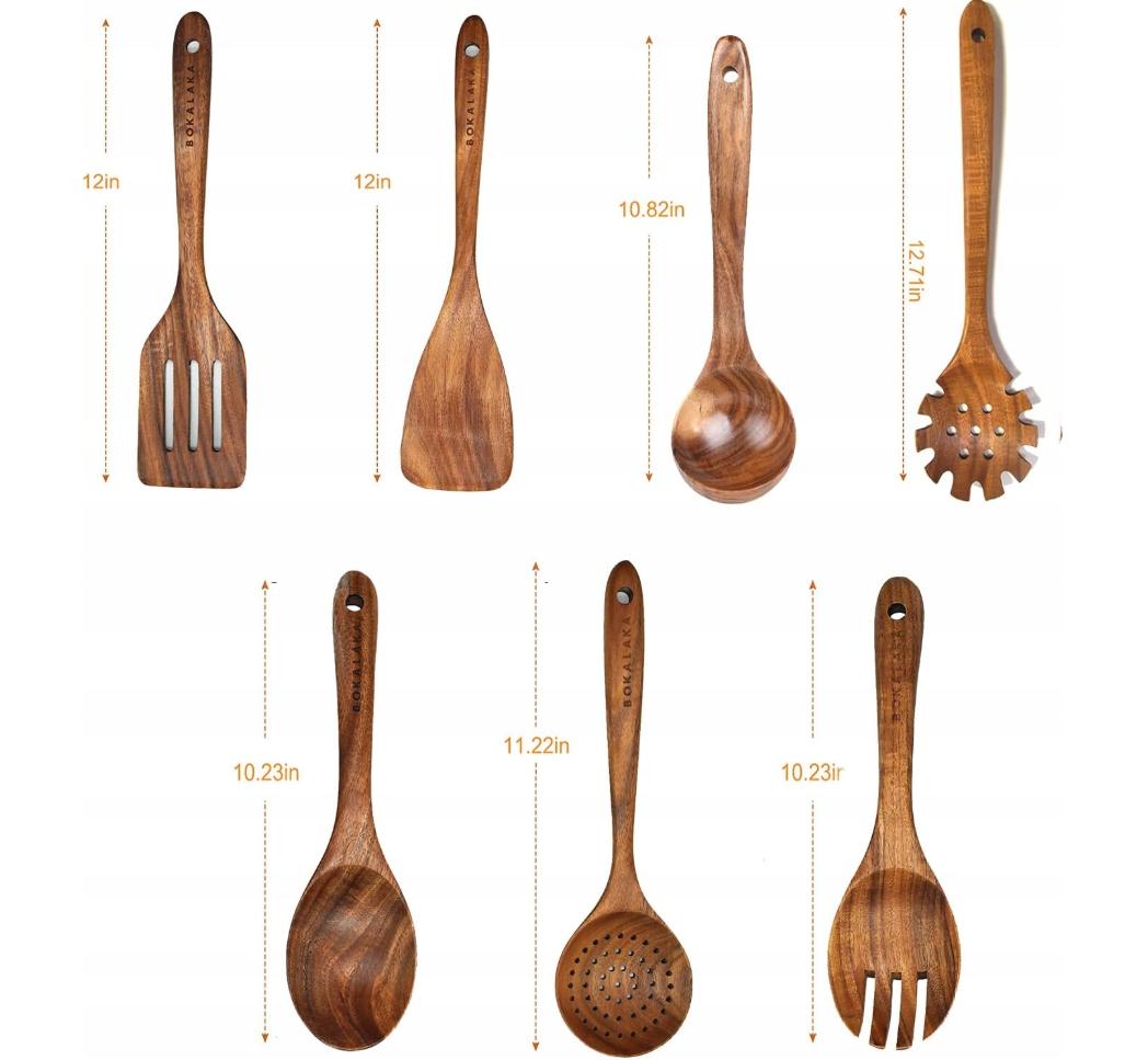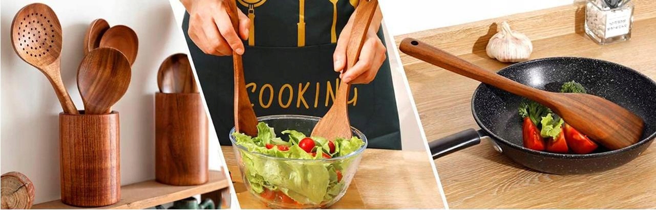 Набір кухонних аксесуарів виготовлений з міцного, твердого натурального дерева без запаху. Відтінок деревини помітний, додаючи тепла та якості вашій кухні. Незалежно від того, чи йдеться про комфорт приготування їжі чи естетику кухні, ви відчуєте природну красу деревини.