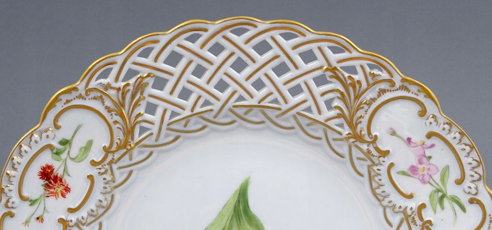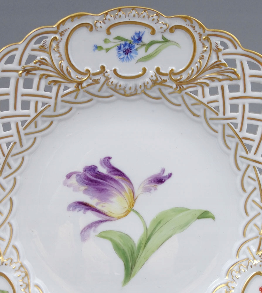 кожна з табличок з коміром з відкритим робочим дбайливим коміром, на яких три резерви розміщували ніжні гілки квітів. Коміл закінчив хвилястим, золотистим краєм. У дзеркалі кожної тарілки більший малюнок квіткових композицій.